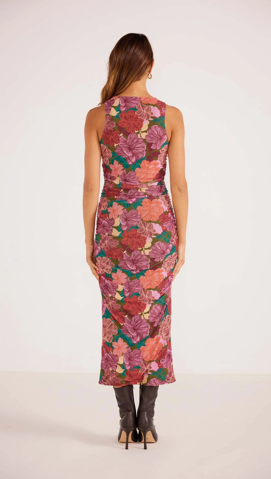 MINKPINK ZORA RUCHED MIDI DRESS FALL FLORAL