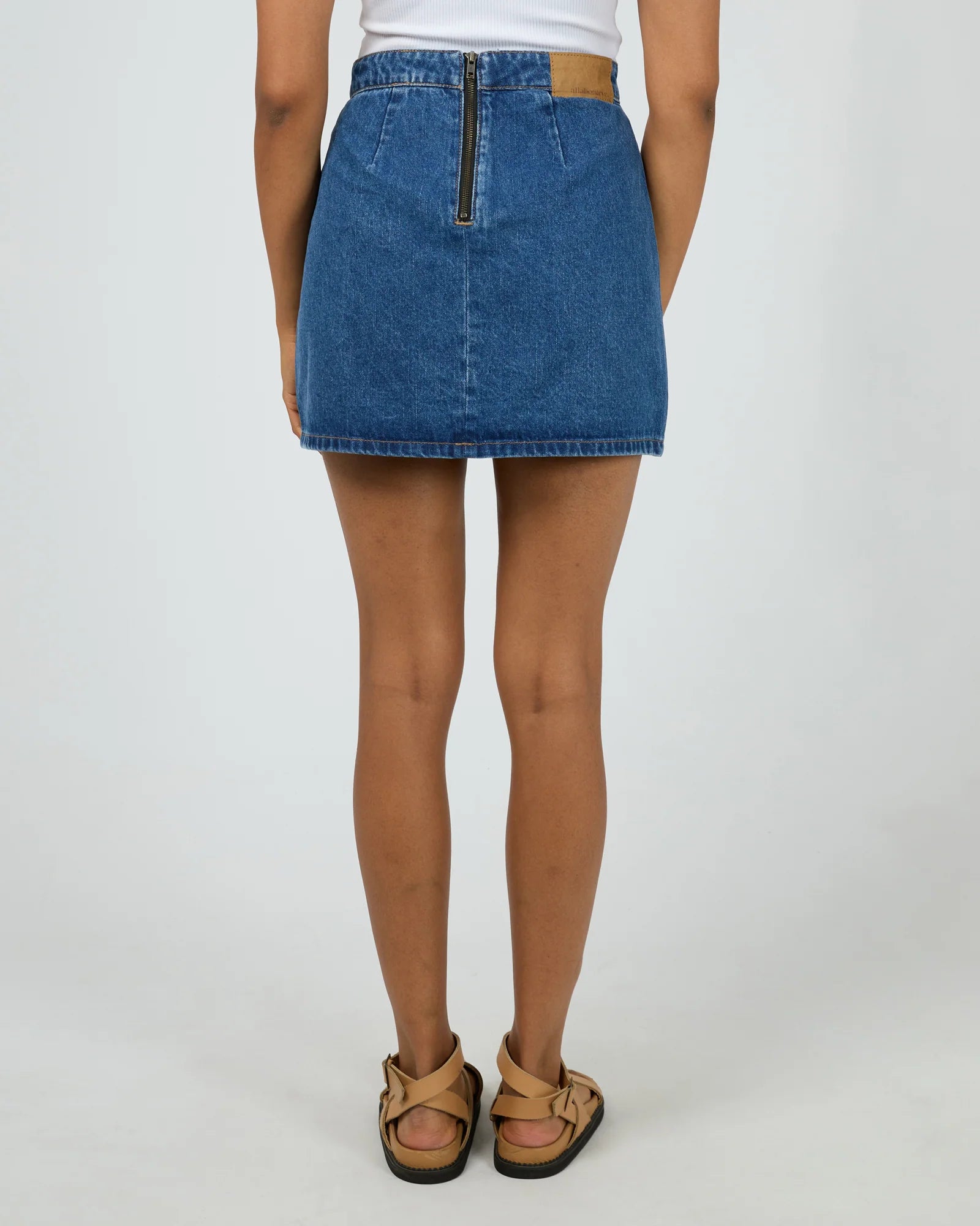 The All About Eve Becca Skirt in Heritage Blue is a versatile denim piece perfect for any season. Made from 100% cotton rigid denim, it features practical front utility pockets and a back zip closure for easy wear. Contrast top stitching adds stylish detail, making it easy to dress up with boots or keep casual with a tee and Converse. Model is wearing size 8.