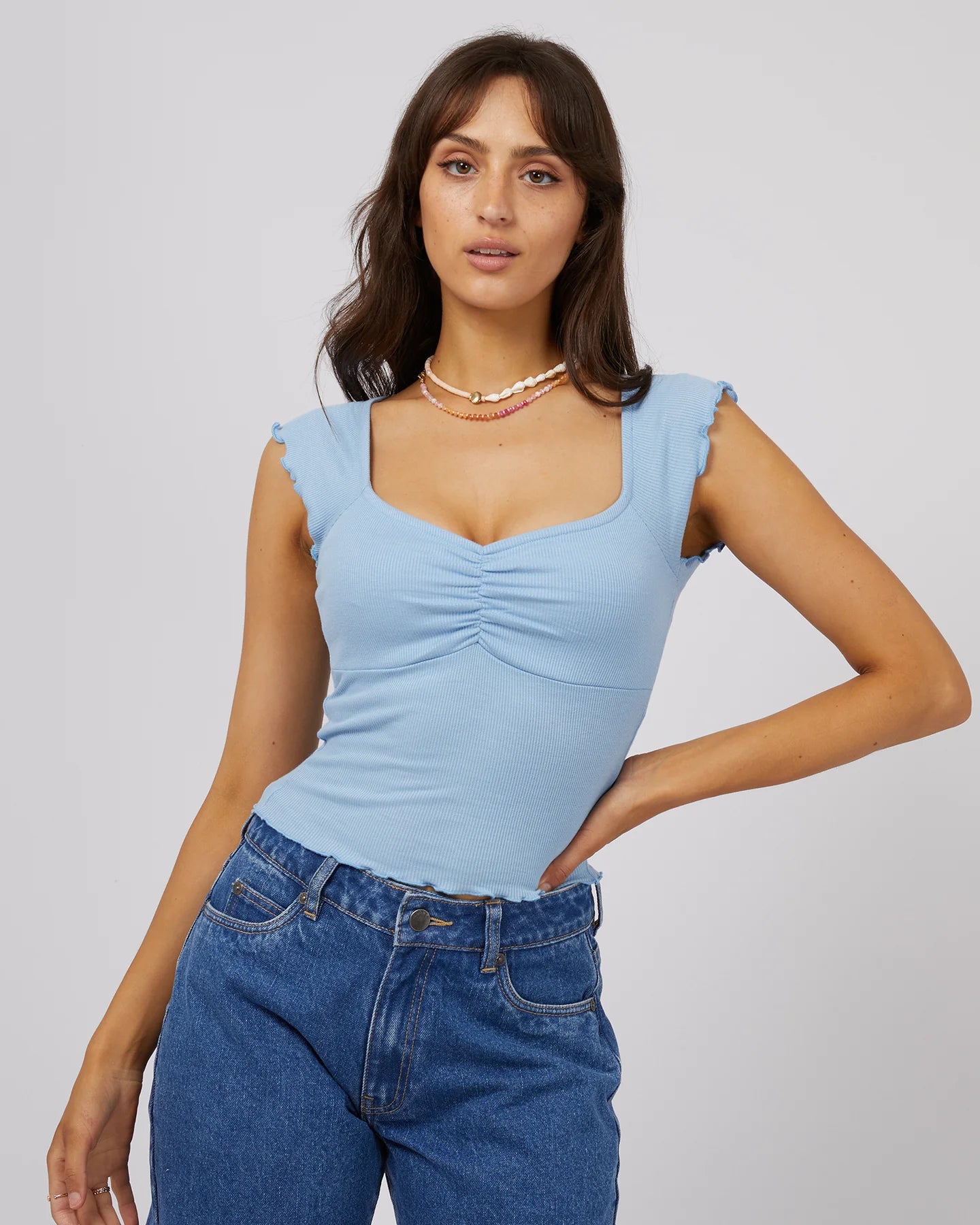 Elevate your wardrobe with our Bree Top. Versatile and modern, it features a soft hand feel, short sleeves, a lettuce hem finish, a square neck line, and a ruched bust. Perfect for a casual look with denim and sneakers, or dress it up with statement jewelry and heels for a night out. Made with a premium blend of fabrics, this top is a must-have.