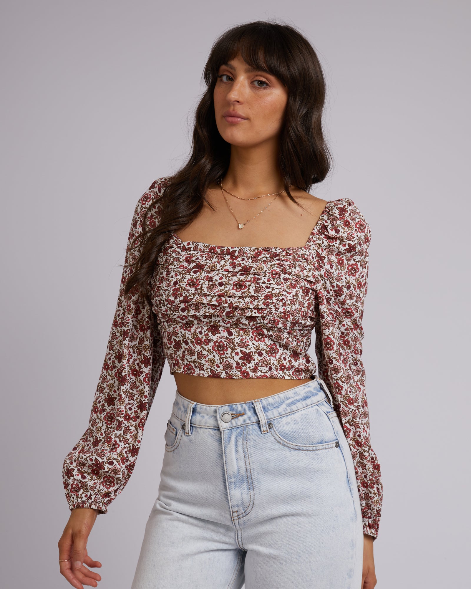Introducing the Elle Floral Top from ALL ABOUT EVE. This exclusive print top features a gorgeous floral boarder and comes with long sleeves for cooler days. The fully shirred back provides maximum comfort. Elevate your wardrobe with this must-have piece.