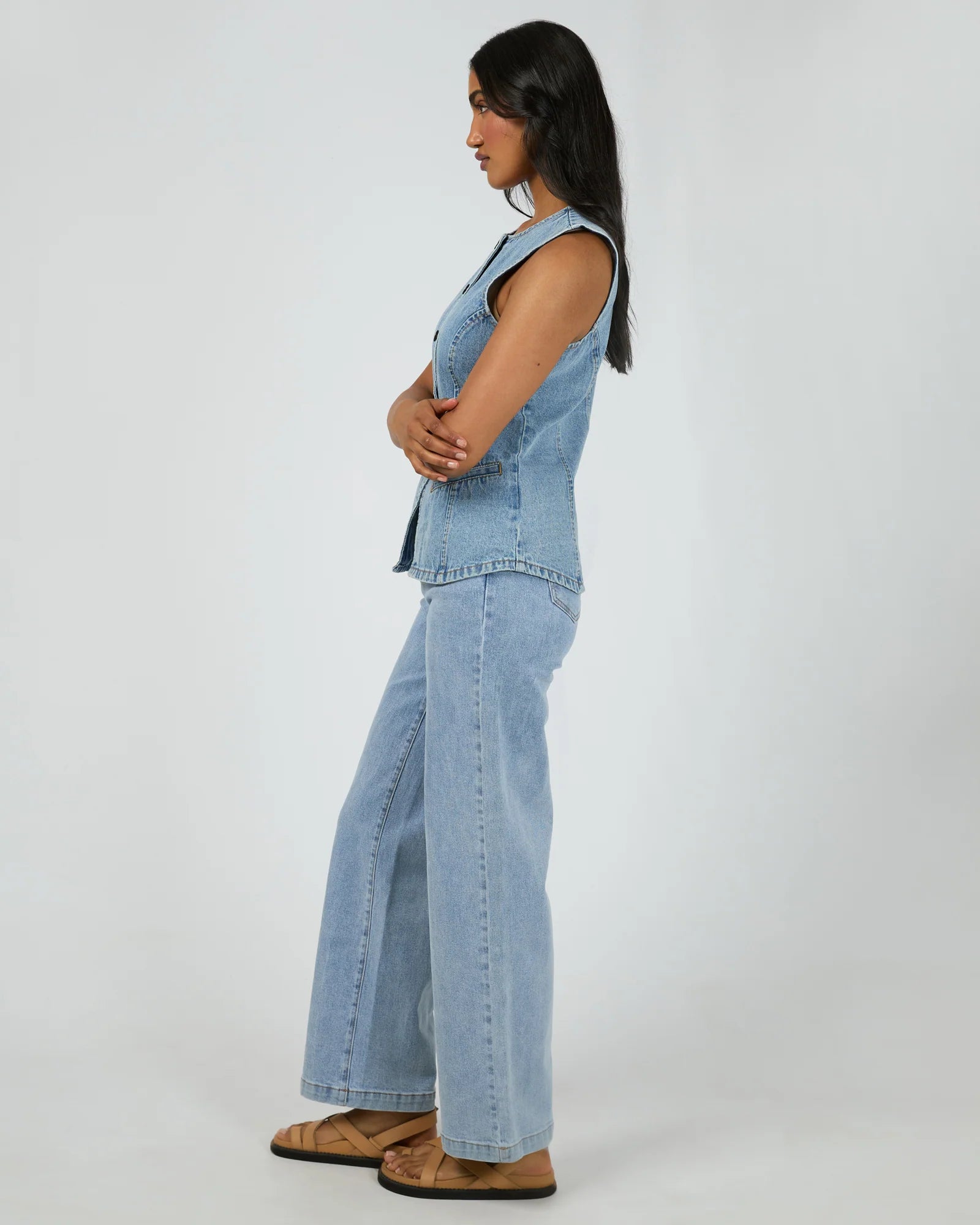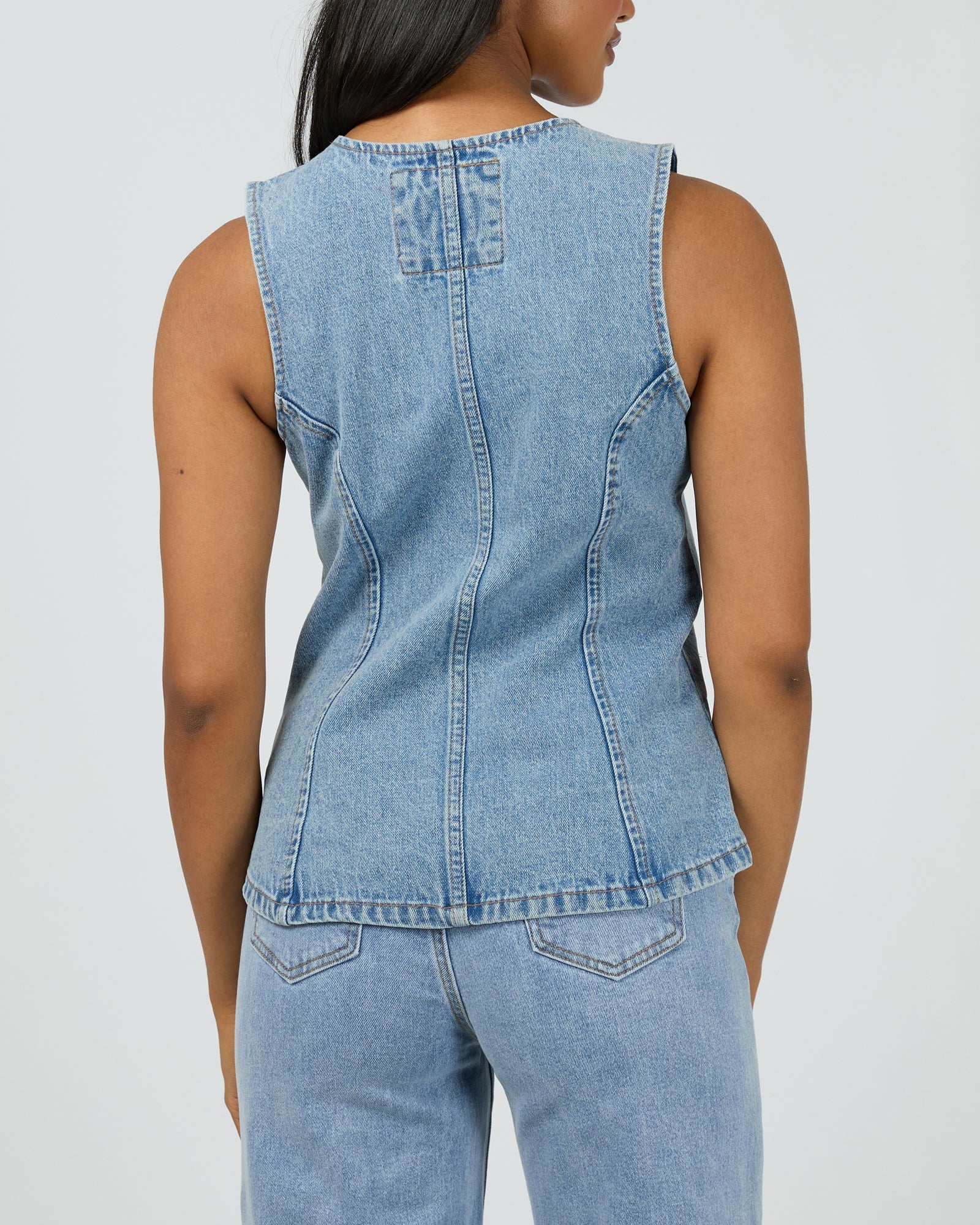 The All About Eve Lena Denim Vest in light blue features a classic button-down front and a split hemline for a comfortable, flattering fit. Made from 100% non-stretch cotton denim, it’s perfect for layering to add a timeless, casual touch to your wardrobe. Model is wearing size 8.