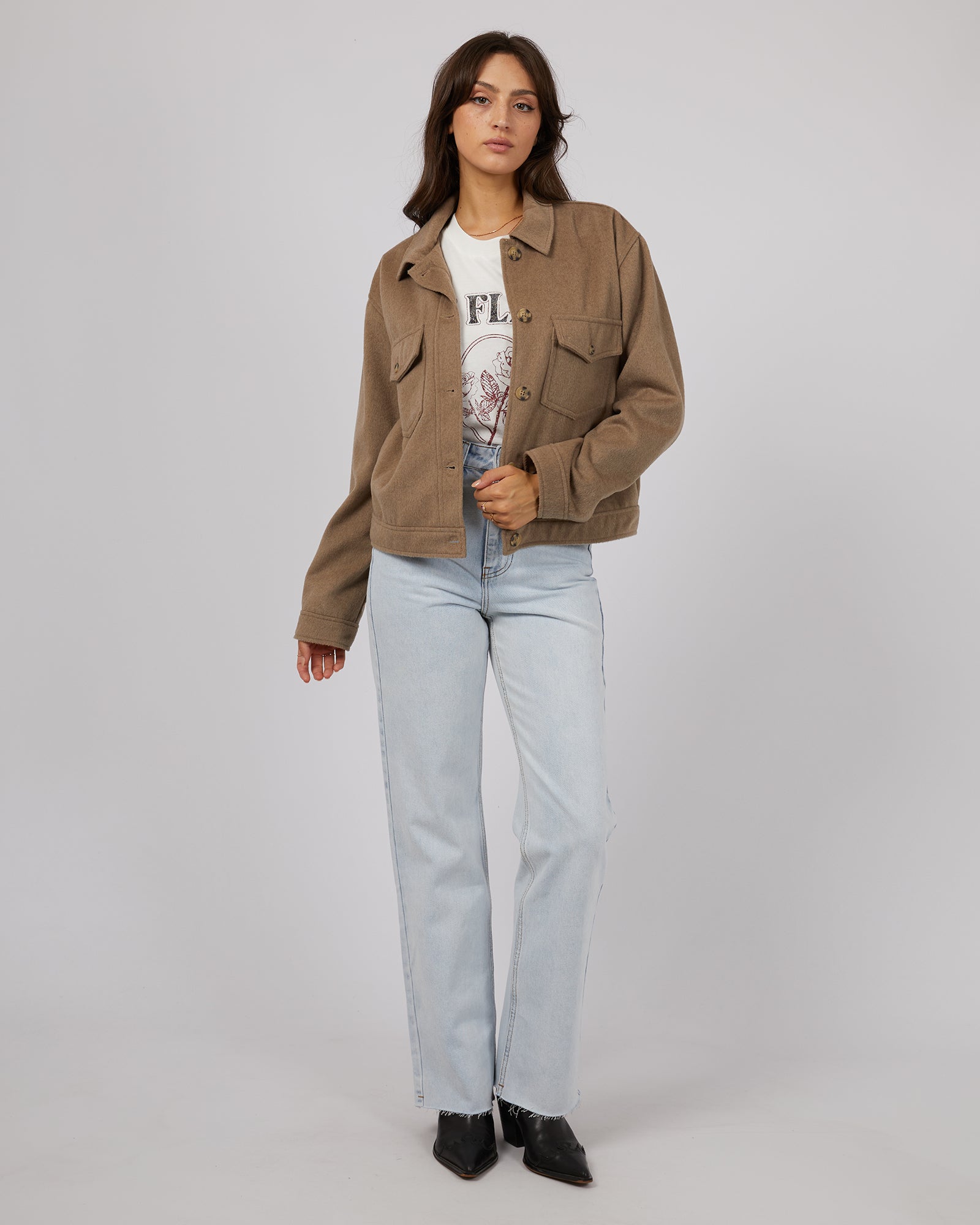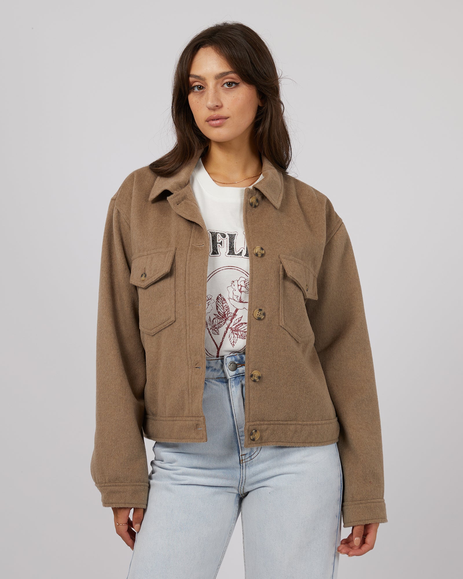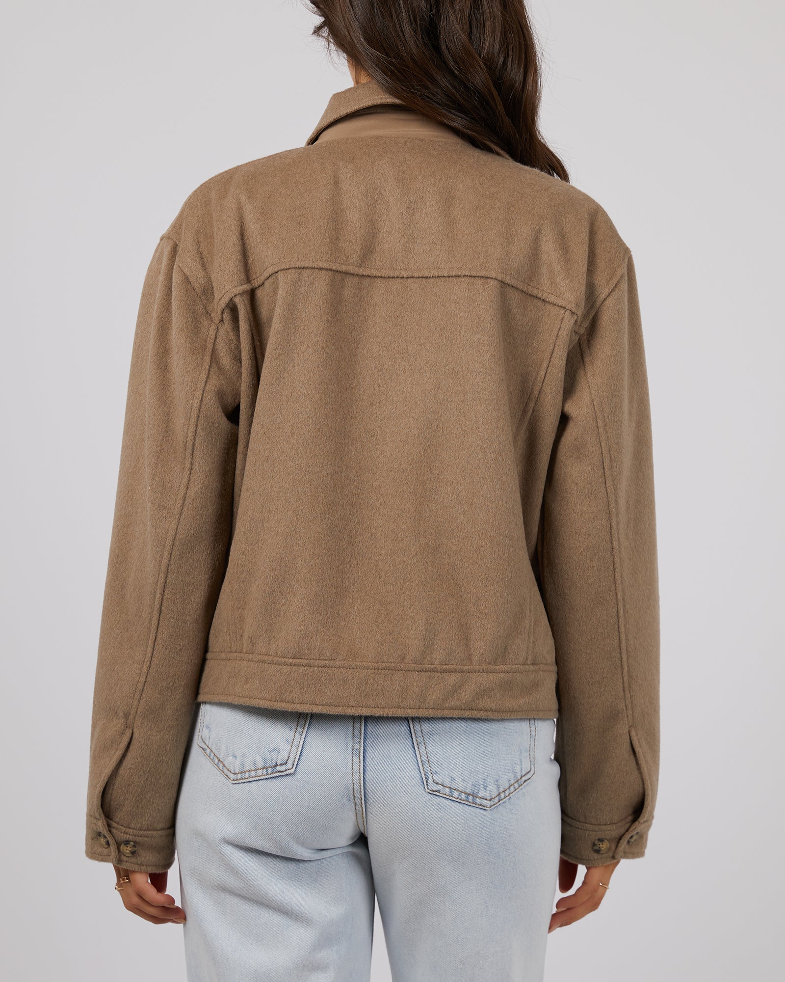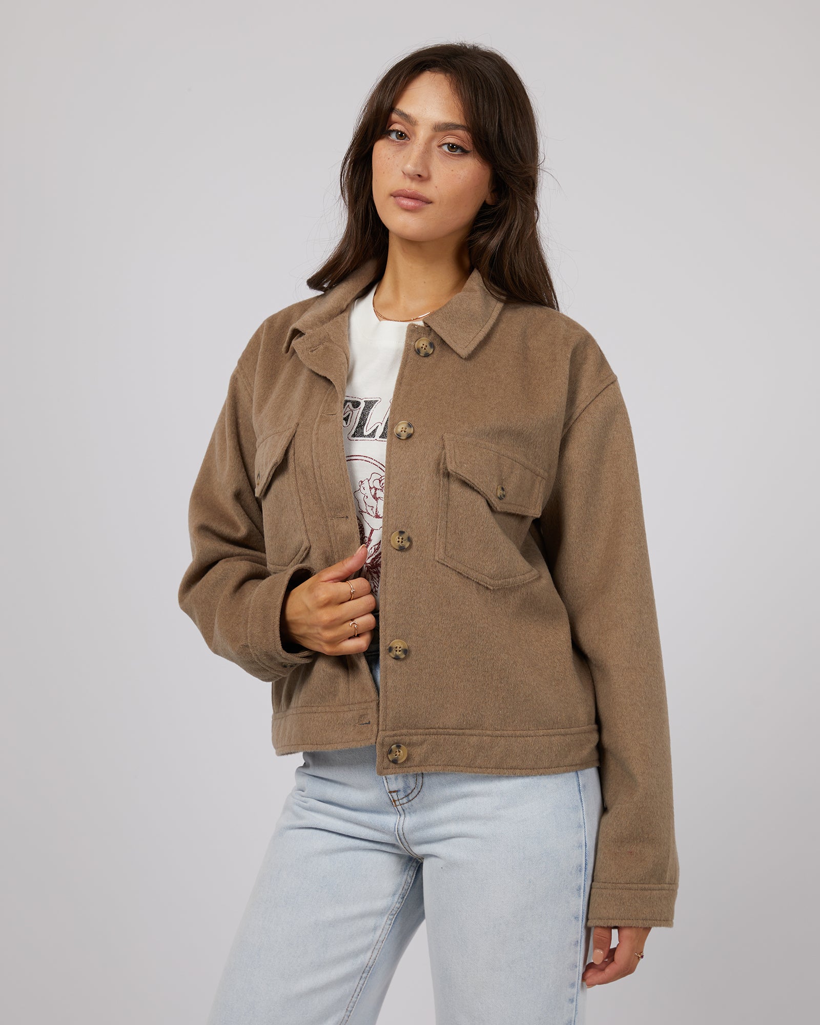 Experience ultimate comfort and style with the Mahina Cropped Shacket from All About Eve. Perfect for cooler days, this warm autumn brown jacket features a soft finish that will keep you cozy all season long. Stay fashionable and warm with the Shacket, a must-have addition to your wardrobe.