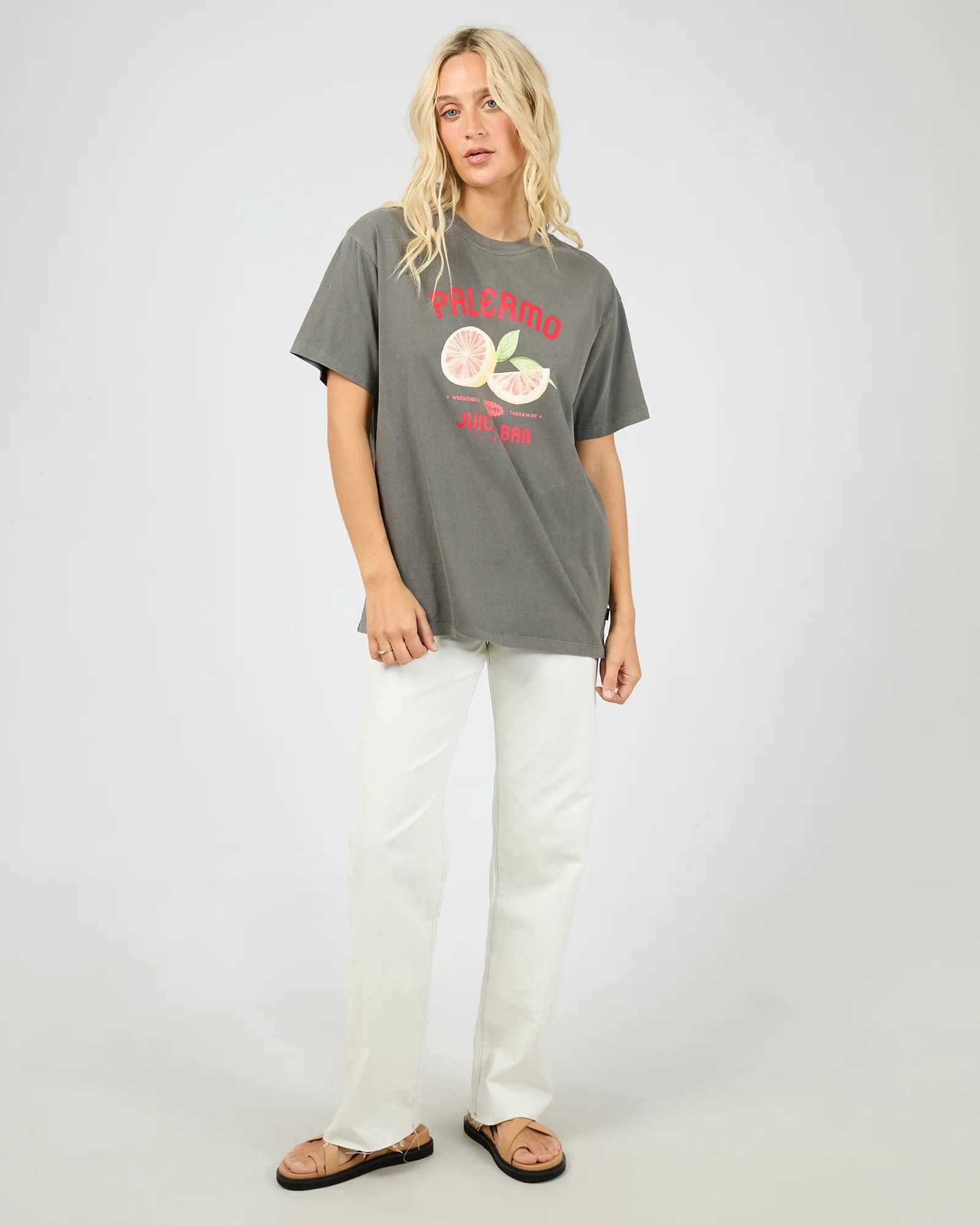Make a statement with the Palermo Relaxed Tee, where charcoal meets bold red text and a vibrant grapefruit graphic for instant personality. Cut from 100% soft cotton with a relaxed crew neckline, this tee prioritises comfort without sacrificing style. The laid-back fit pairs beautifully with denim or wide-leg trousers, giving you an effortless, eye-catching everyday essential that feels as good as it looks.