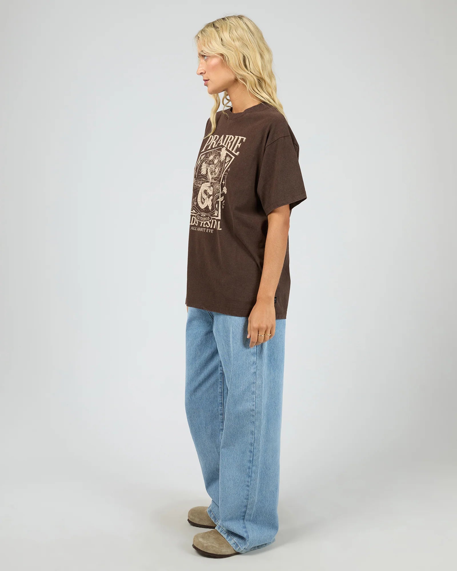 The Prairie Relaxed Tee in Brown is your go-to for laid-back style and comfort. Featuring an exclusive All About Eve Fields Festival graphic on soft carded cotton jersey with a vintage wash, this relaxed-fit tee pairs effortlessly with jeans or shorts for casual outings. The 235GSM fabric offers durability and a comfortable drape that feels as good as it looks.