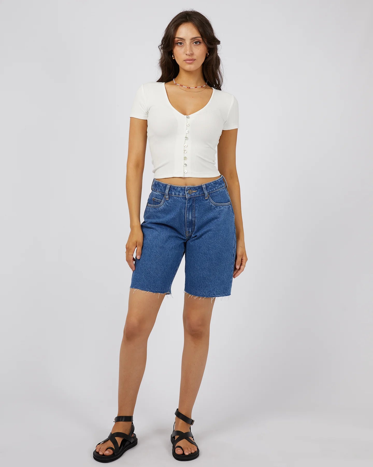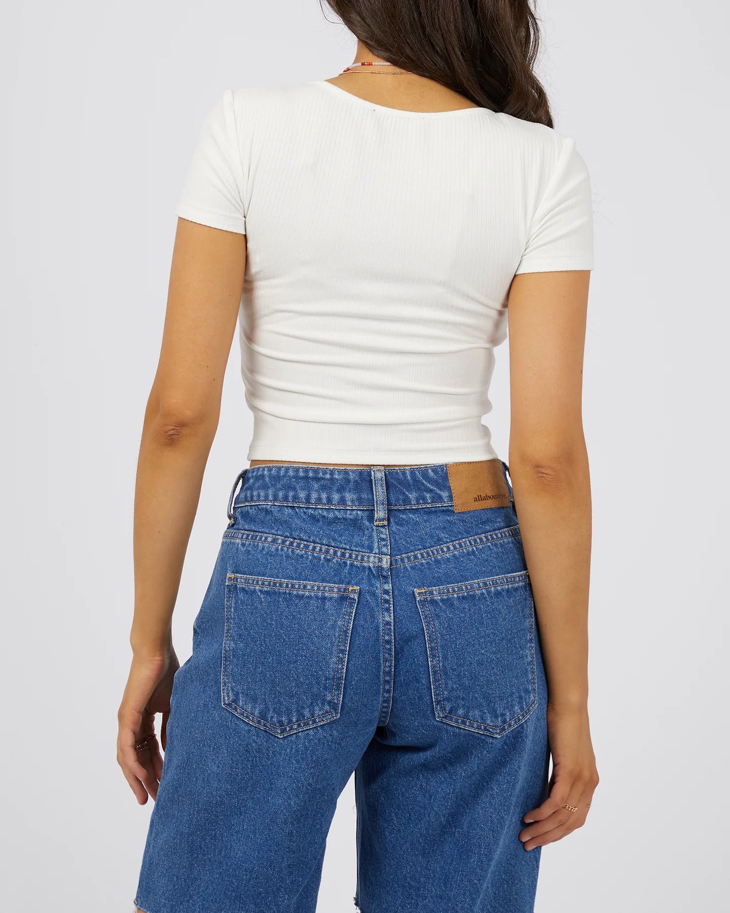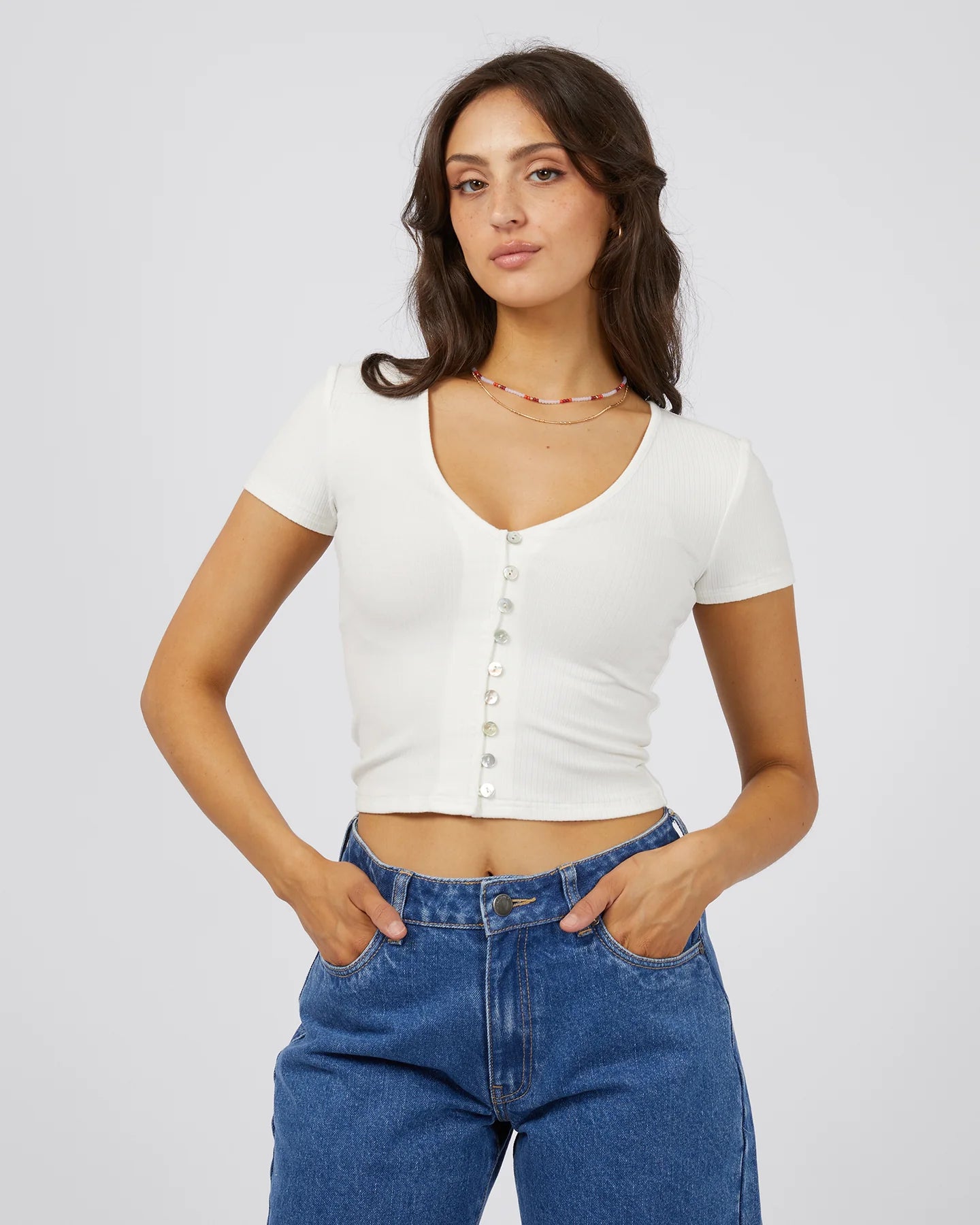 The ALL ABOUT EVE SLOANE TOP WHITE is a versatile and stylish addition to any summer wardrobe. Featuring a cropped fit and button detail along the front, this top can be dressed up or down for any occasion. Made from 95% Viscose and 5% Spandex, it offers comfort and a classic vibe.