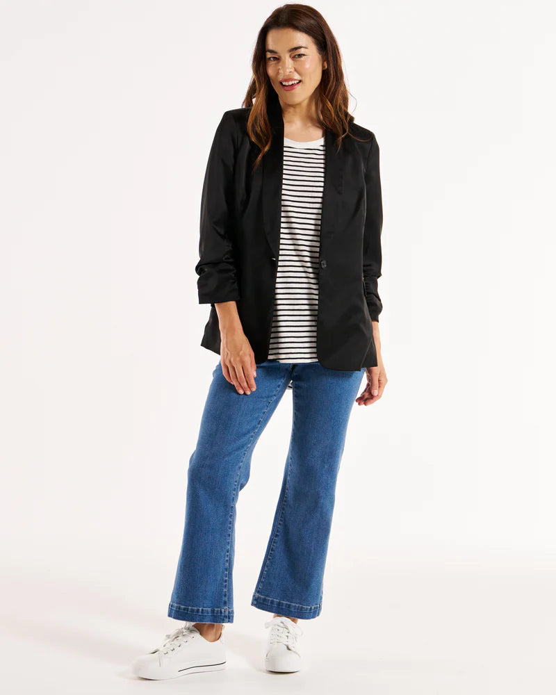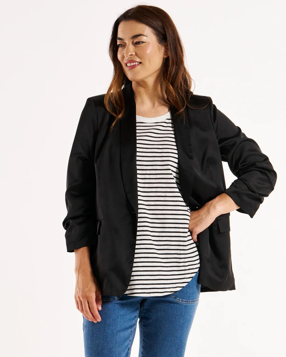 Upgrade your wardrobe with the BETTY BASICS JAYDE SATIN BLAZER BLACK. Featuring ruched sleeves and a luxurious satin hand feel, this blazer effortlessly combines sophistication and comfort. Its single-breasted design with button closure pairs classic style with practicality, while the flap pockets add a touch of chic detail. Versatile and timeless, this blazer will elevate any outfit, whether for a special occasion or a casual day out.
