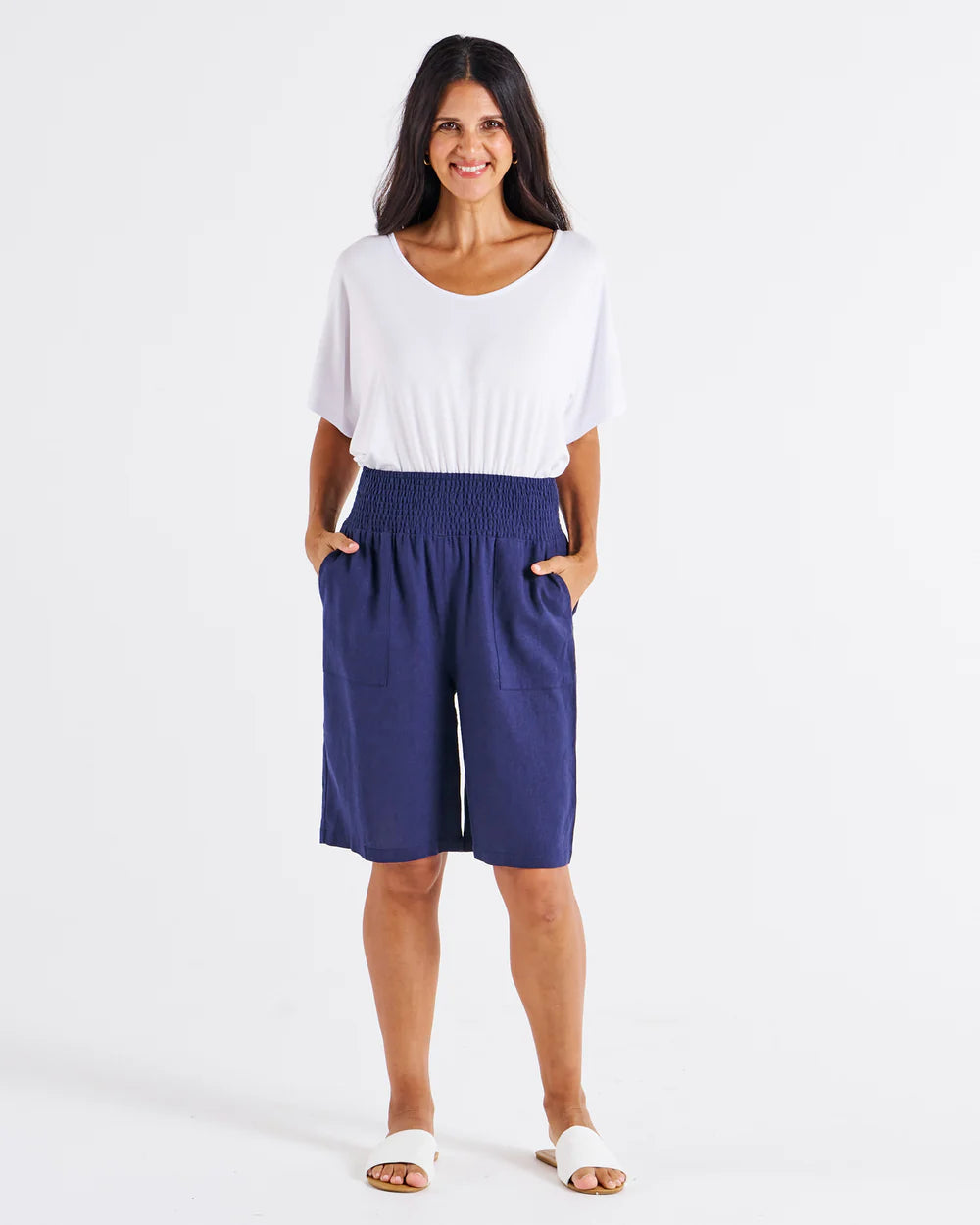Introducing BETTY BASICS LEE BERMUDA SHORT NAVY, the springtime staple for ultimate comfort. Made with a breathable viscose/linen blend, these relaxed-fit shorts feature a shirred waistband and pockets for everyday convenience. Say hello to your new go-to shorts this season.