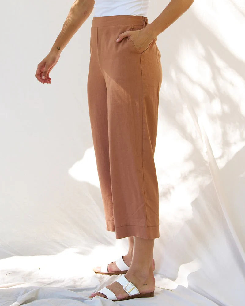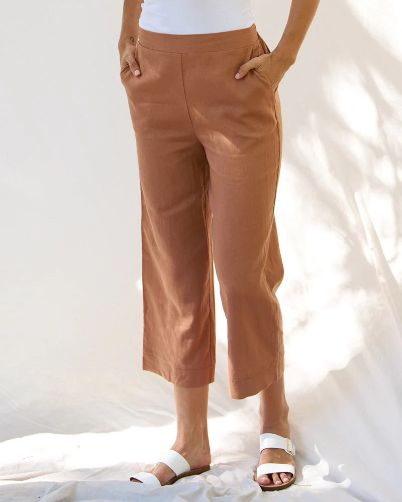 The BETTY BASICS PARKER PANT BRONZE effortlessly blends comfort and style. Made with a breathable blend of Viscose and Linen, these crop-length pants feature convenient cut-away pockets and a flat front waistband with an elasticized back for ease of wear. Perfect for a relaxed, everyday look.
