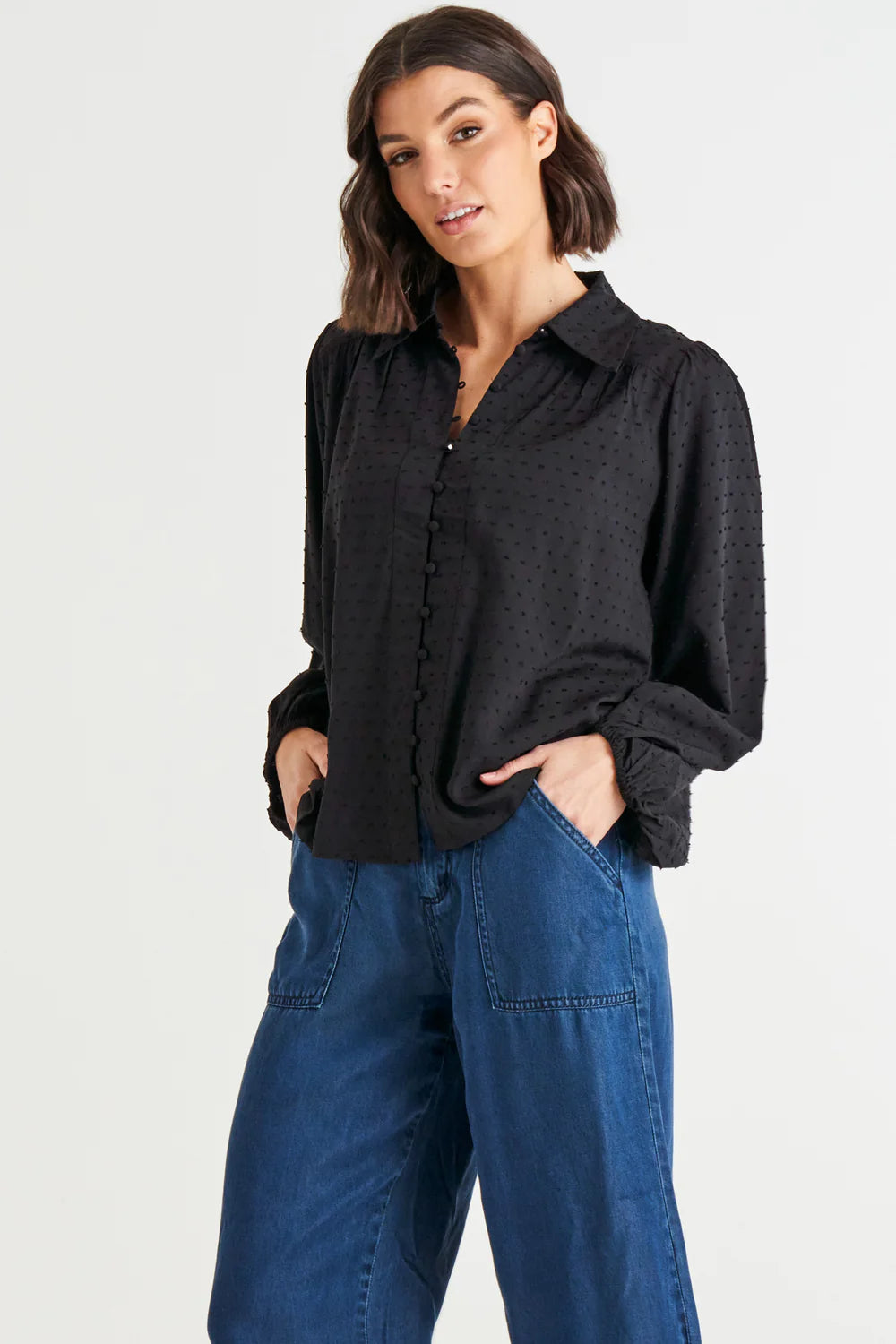 Elevate your wardrobe with the BETTY BASICS SINEAD SHIRT. With a classic collared neck and charming self-fabric buttons, this relaxed fit shirt exudes effortless elegance. The relaxed elastic cuff sleeves add comfort and style to any occasion. Made of 100% viscose, it's perfect for a laid-back yet chic look.