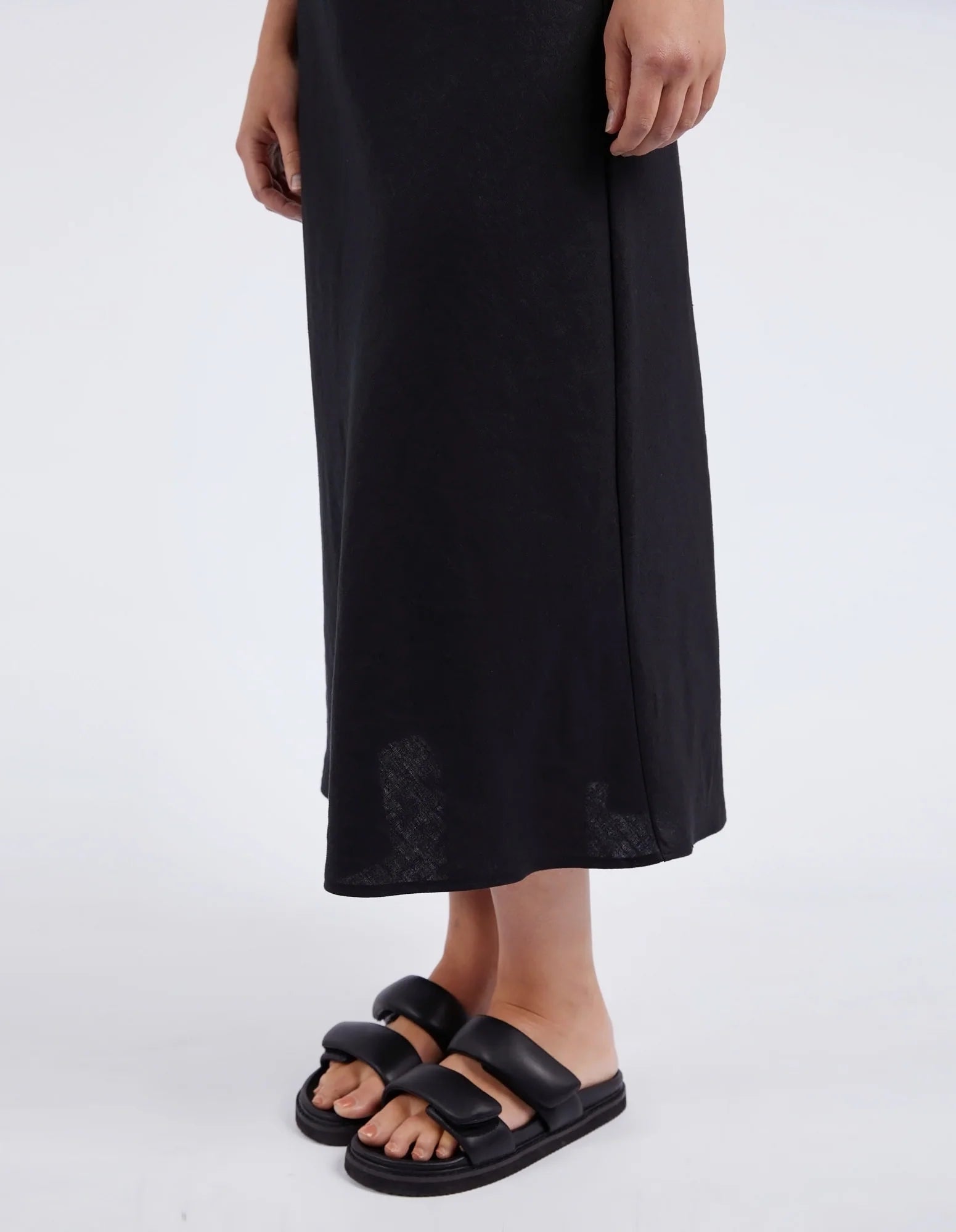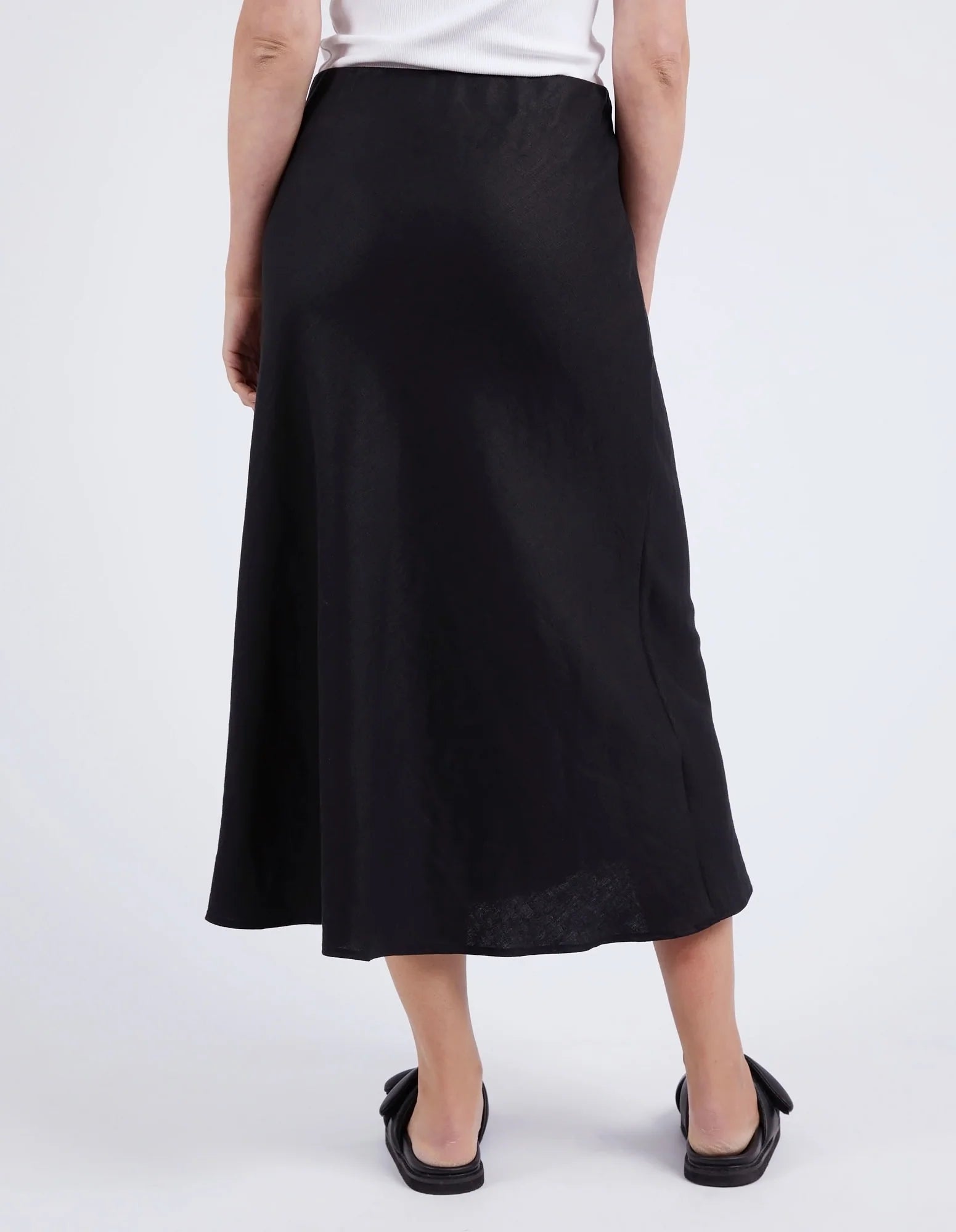 The ELM ELENI SKIRT BLACK is a versatile and flattering addition to any wardrobe. Made with linen and a bias cut, it features an elastic waistband and a slightly flared hemline. Dress it up or down for any occasion.