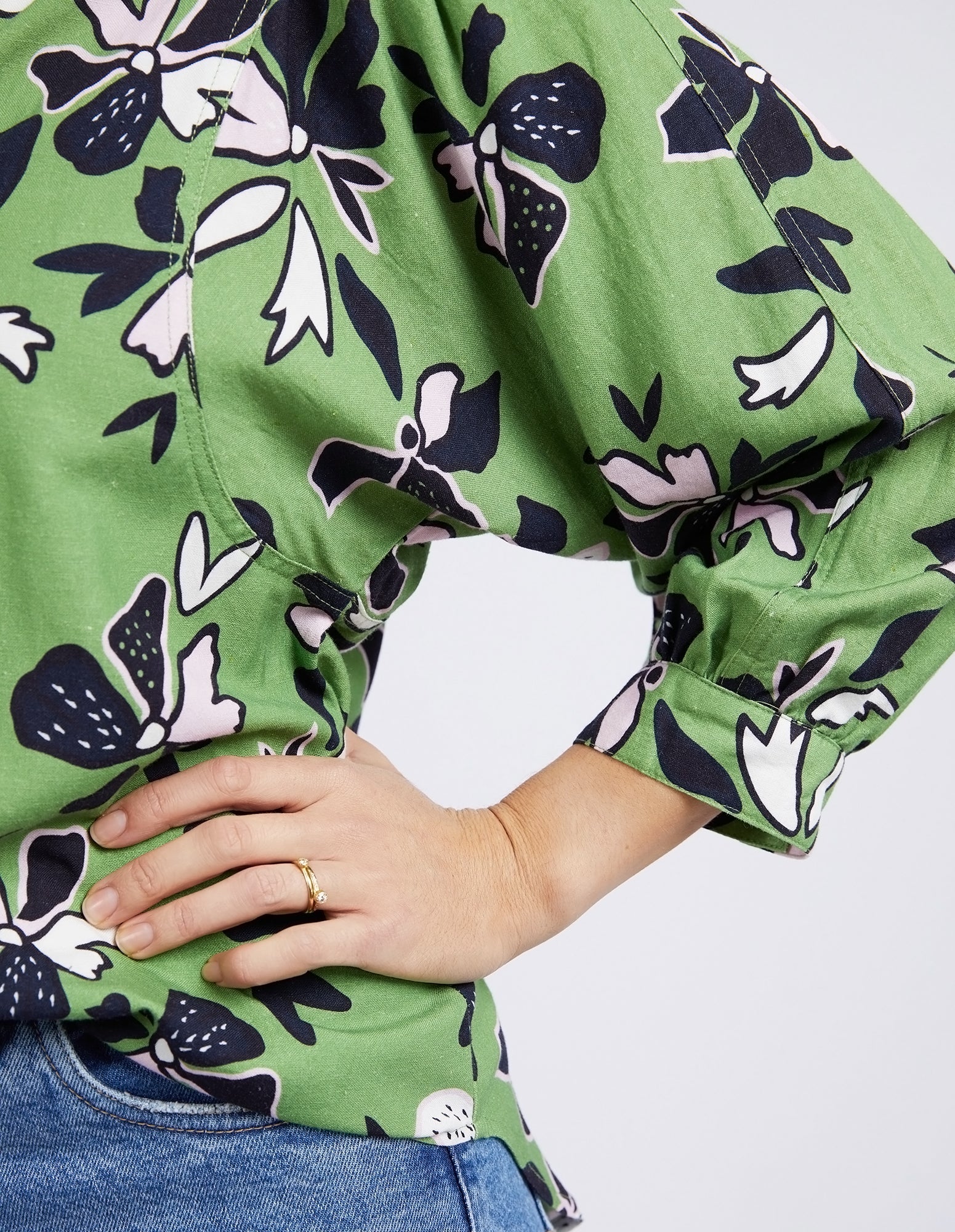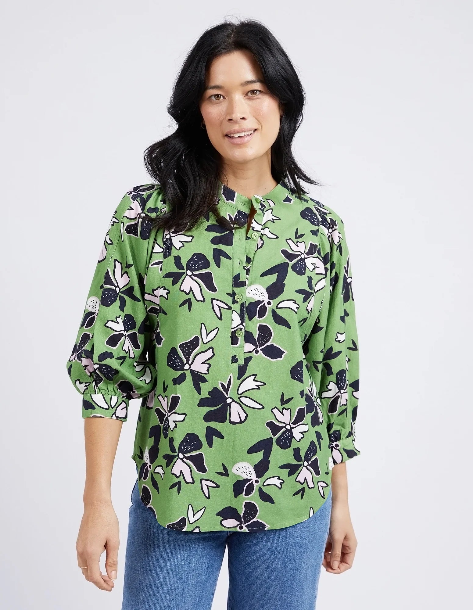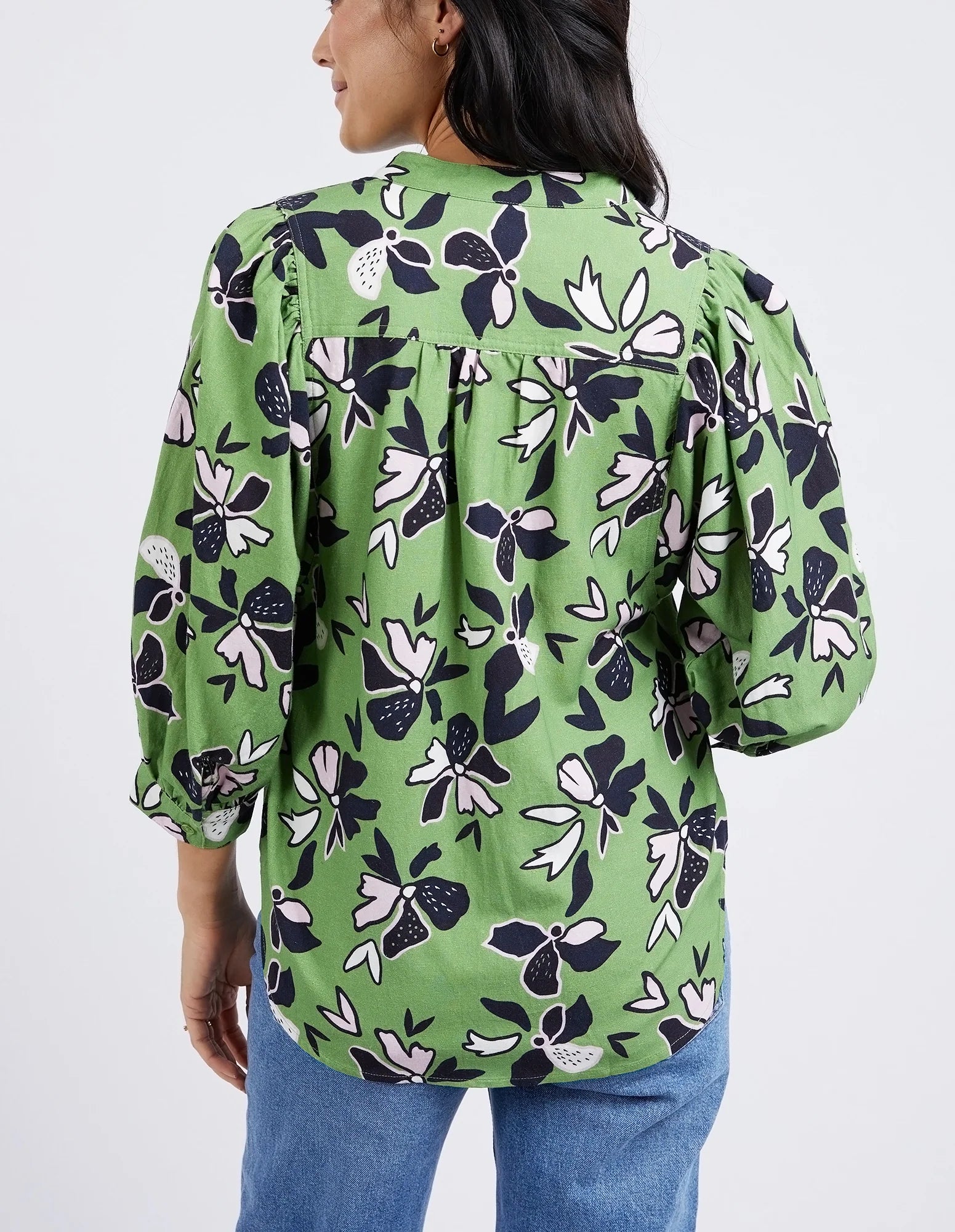 Discover the beauty of our stunning ELM IDYLL FLORAL SHIRT in jungle green. Crafted from a luxurious linen viscose blend, it features gathered 3/4 sleeves and a half button placket. With an exclusive Elm print, this shirt is the perfect blend of style and comfort.