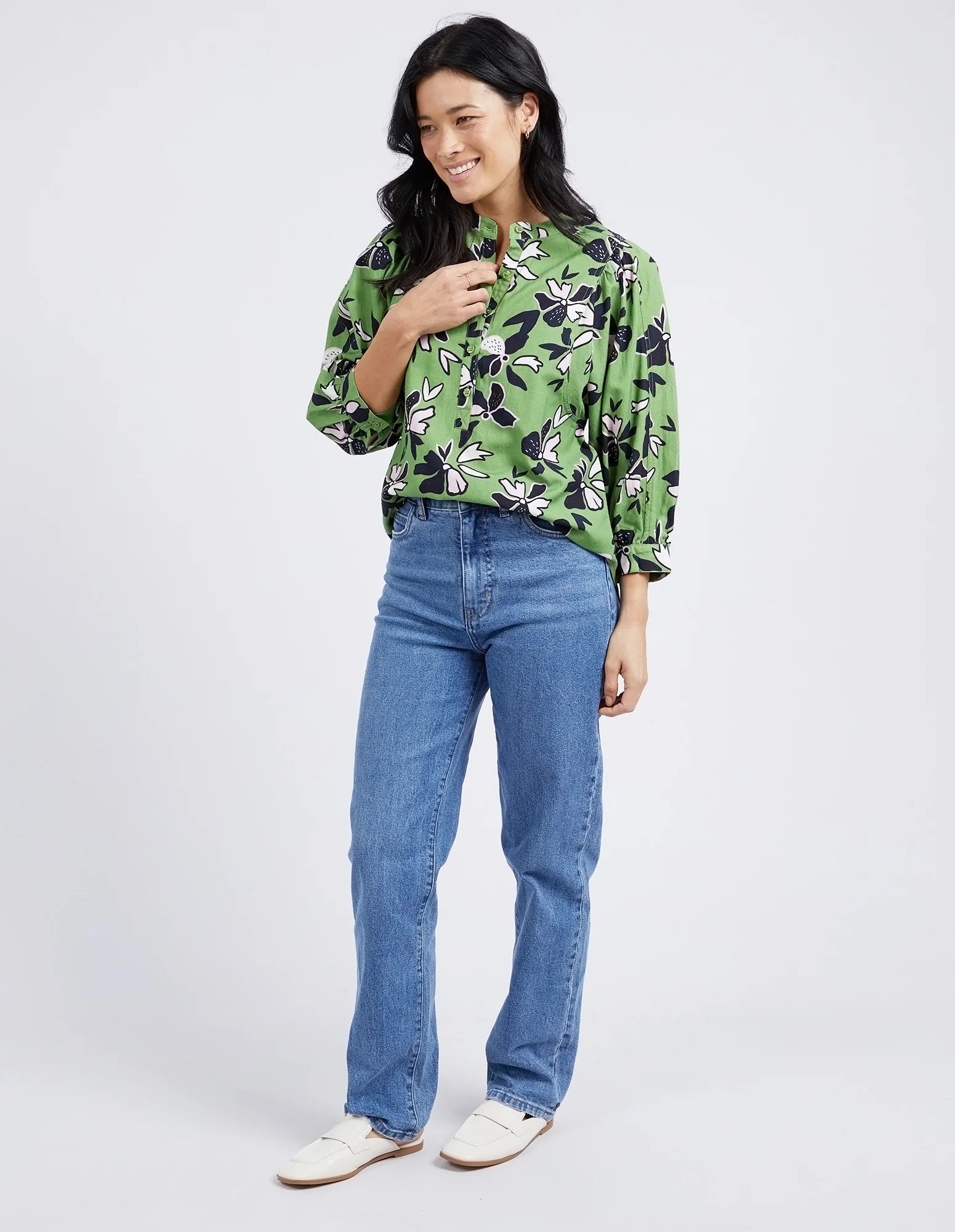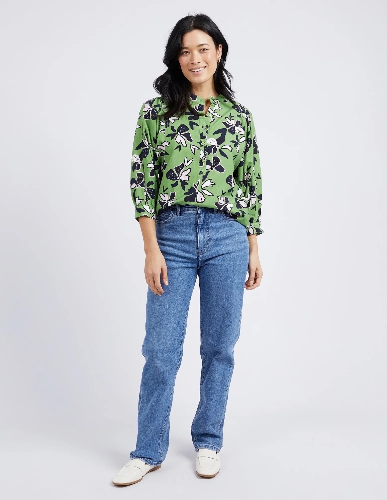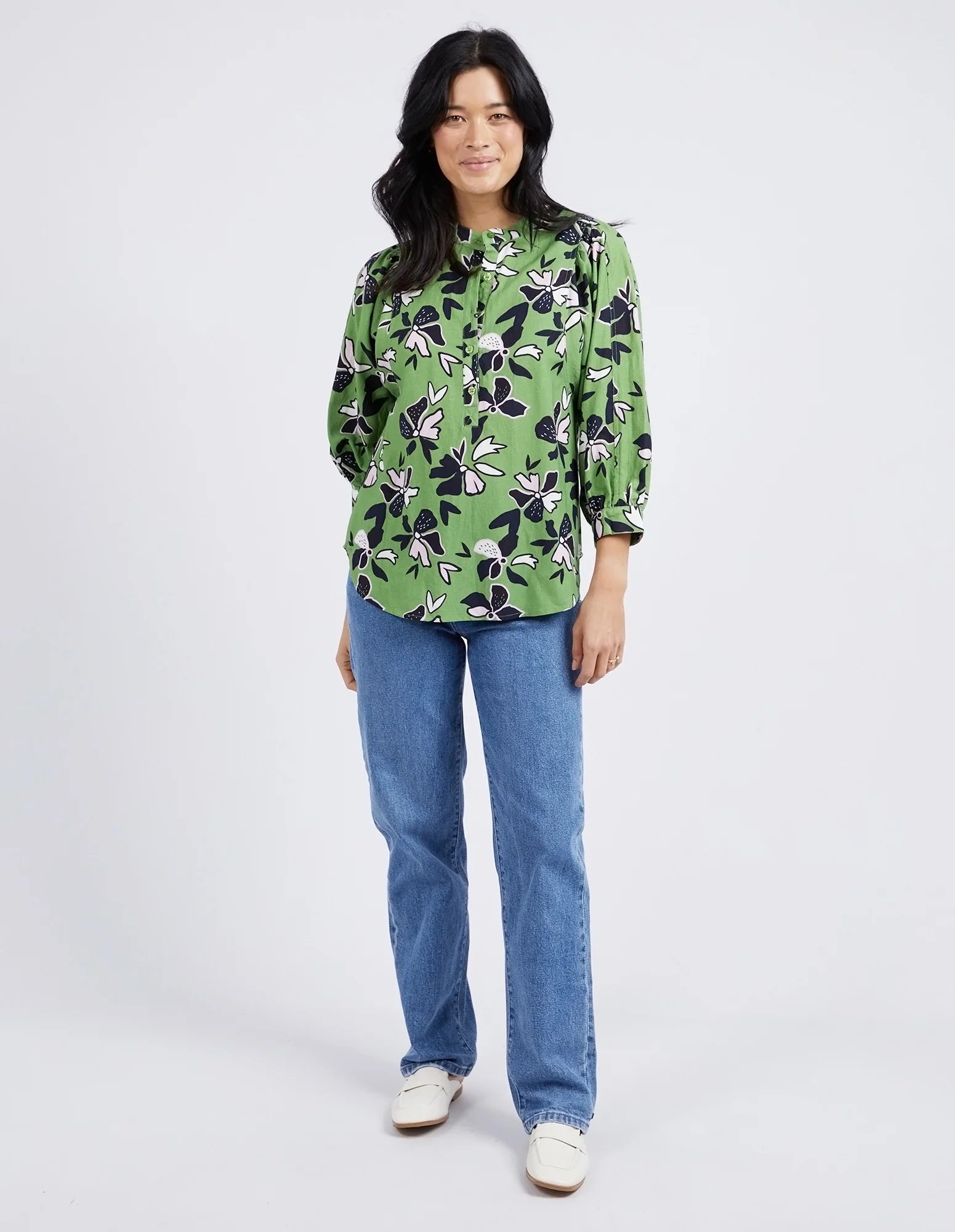 Discover the beauty of our stunning ELM IDYLL FLORAL SHIRT in jungle green. Crafted from a luxurious linen viscose blend, it features gathered 3/4 sleeves and a half button placket. With an exclusive Elm print, this shirt is the perfect blend of style and comfort.