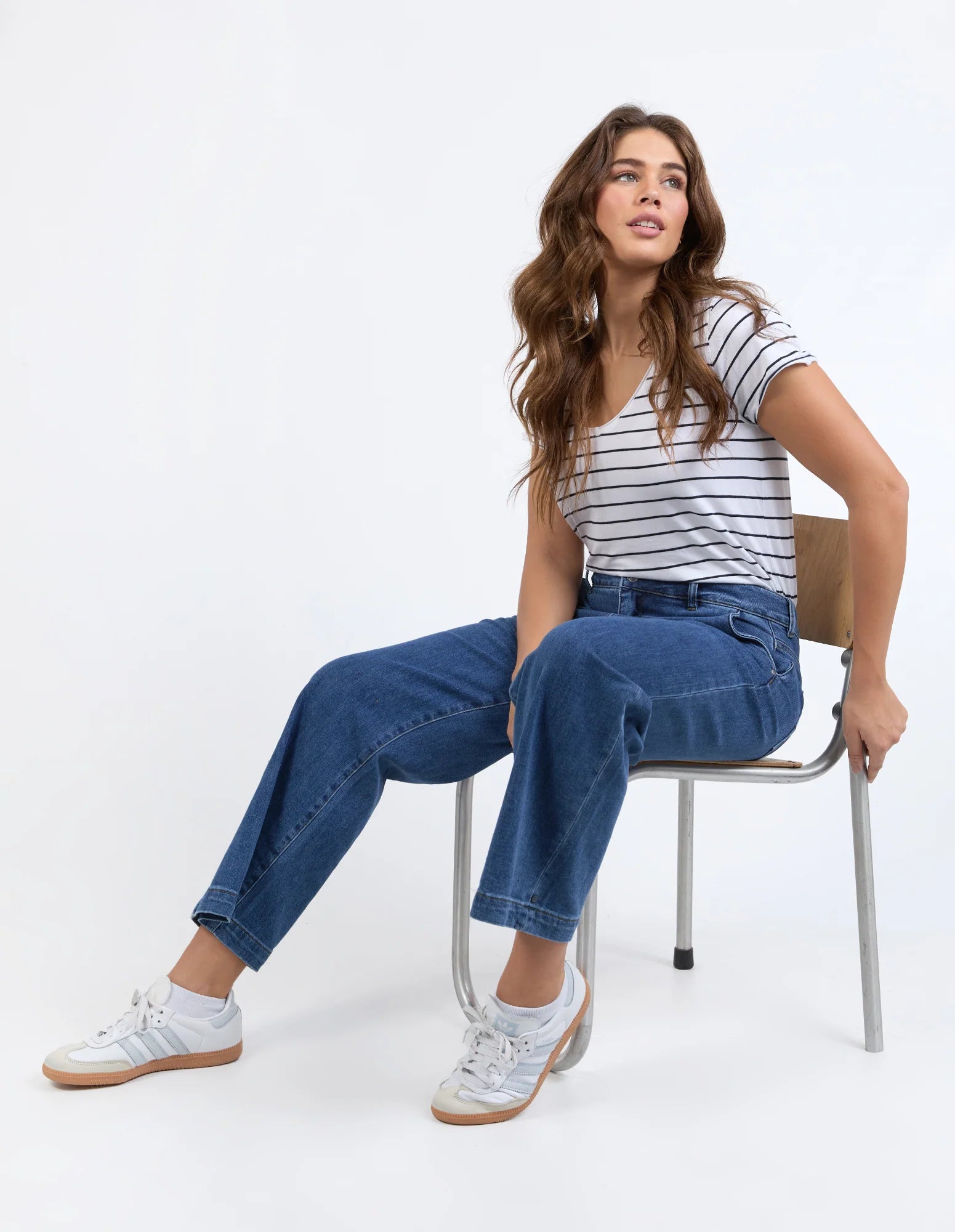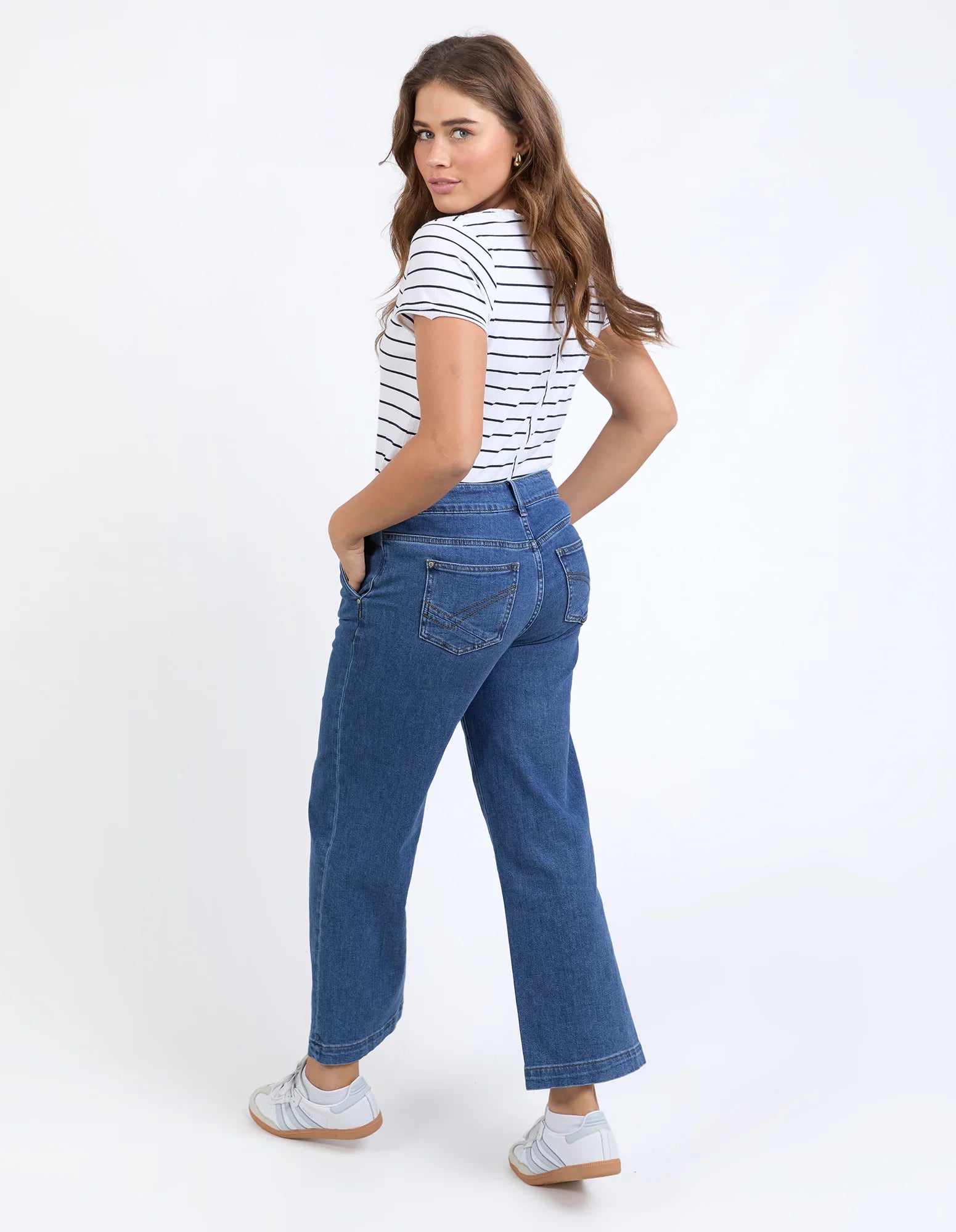 Elm Izzy Wide Leg Jean in dark-blue stretch denim combines comfort with effortless style. The high-rise cut and wide-leg silhouette create a relaxed, flattering fit that works from weekday to weekend. Crafted from soft stretch denim, these jeans feature a fitted waist, full length, front and back pockets for practicality, and enough give to move with you all day. A versatile wardrobe essential that feels as good as it looks.