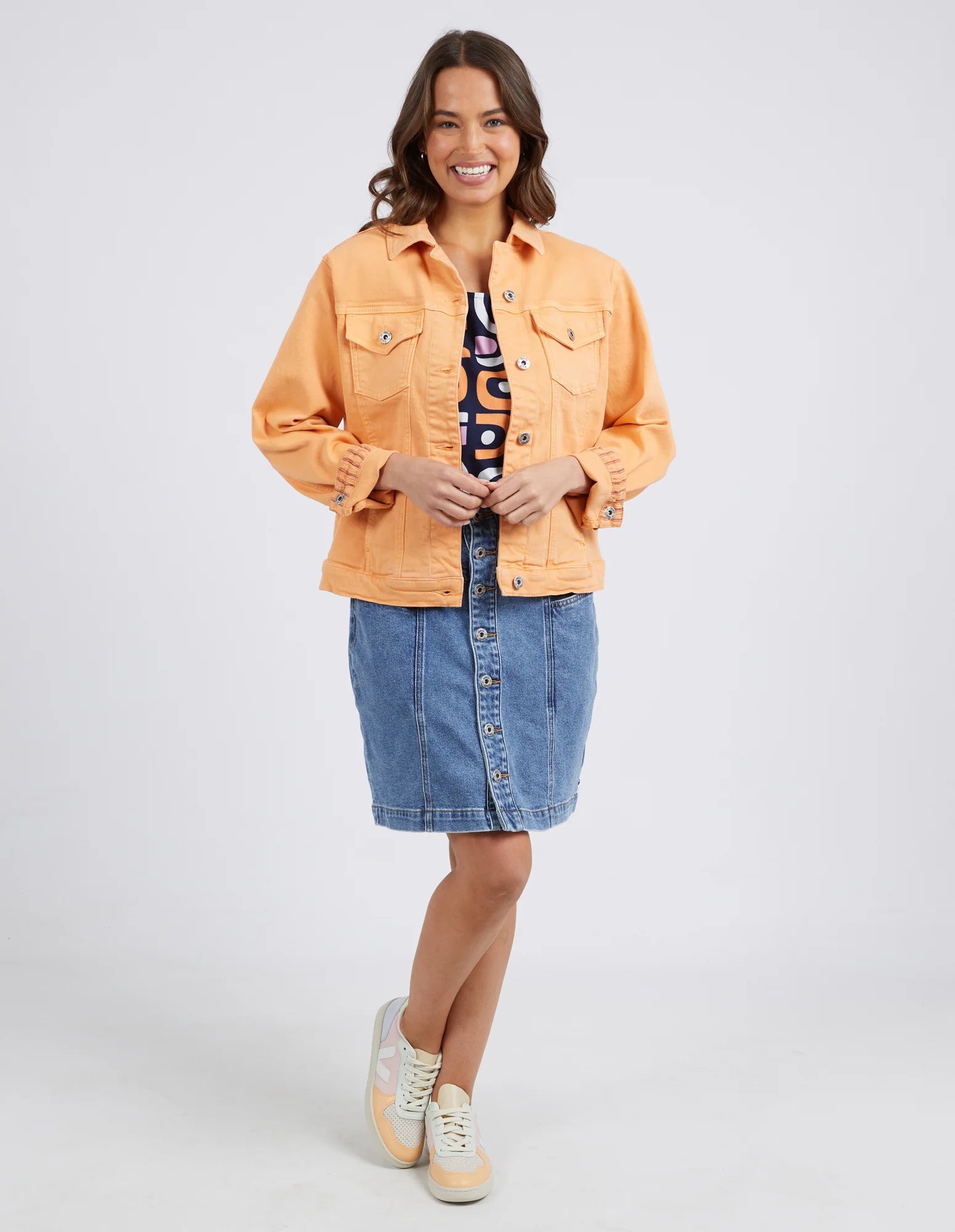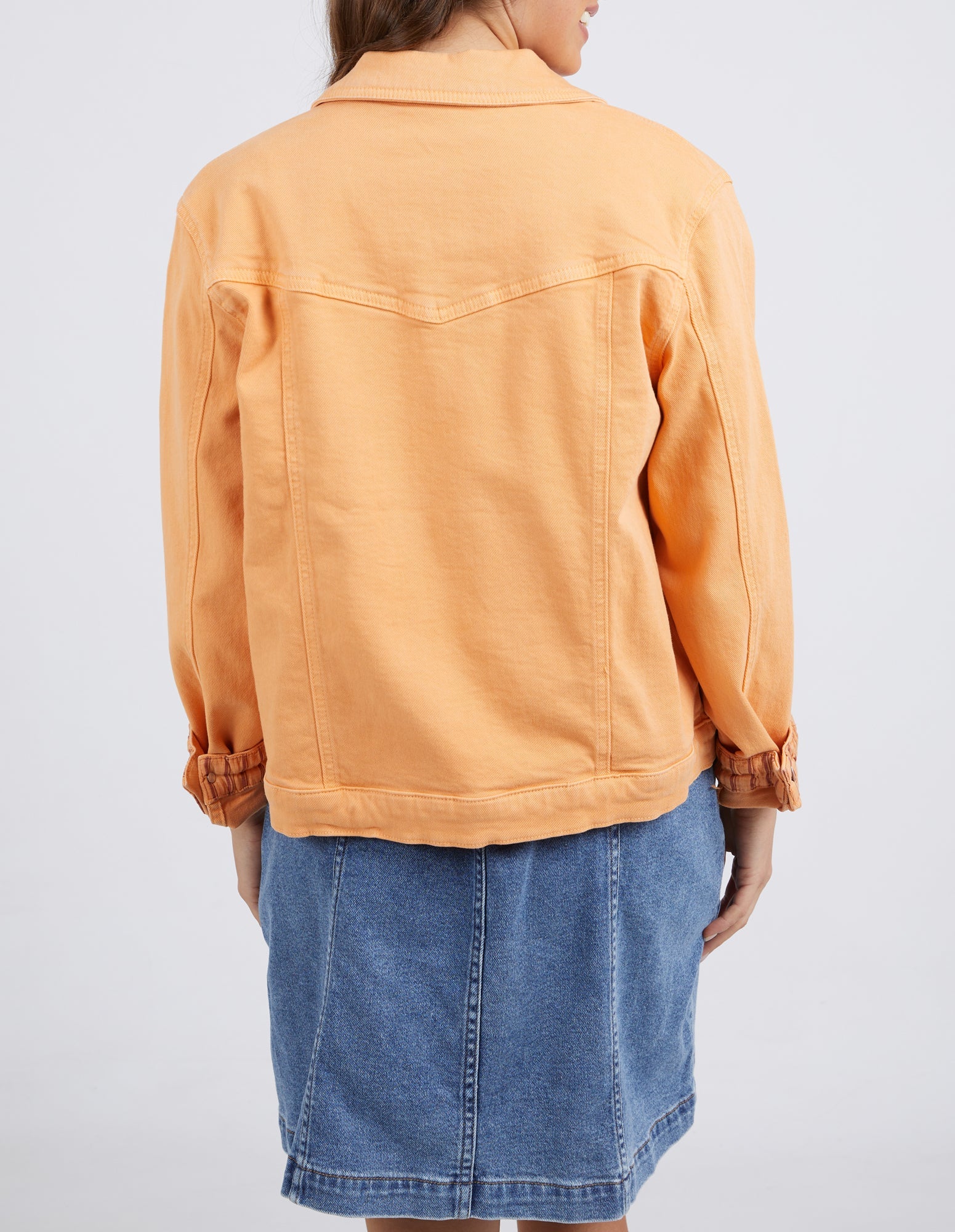 Expertly crafted with stretch denim, the ELM TILLY JACKET MANGO TANGO is the ultimate layering piece. Its timeless design features pockets and Elm hardware, making it both practical and stylish. Add a pop of color to any outfit with our best-selling jacket.