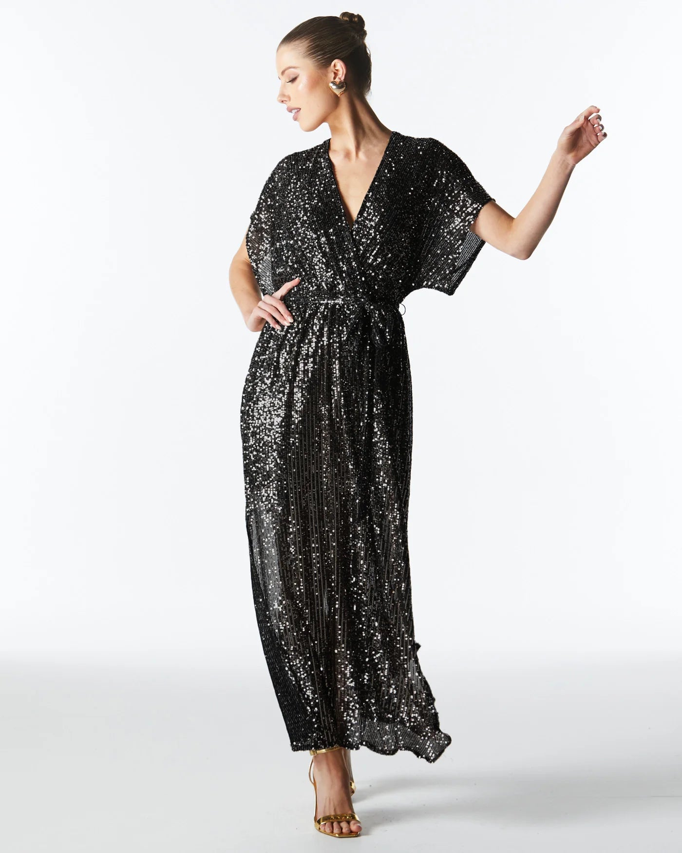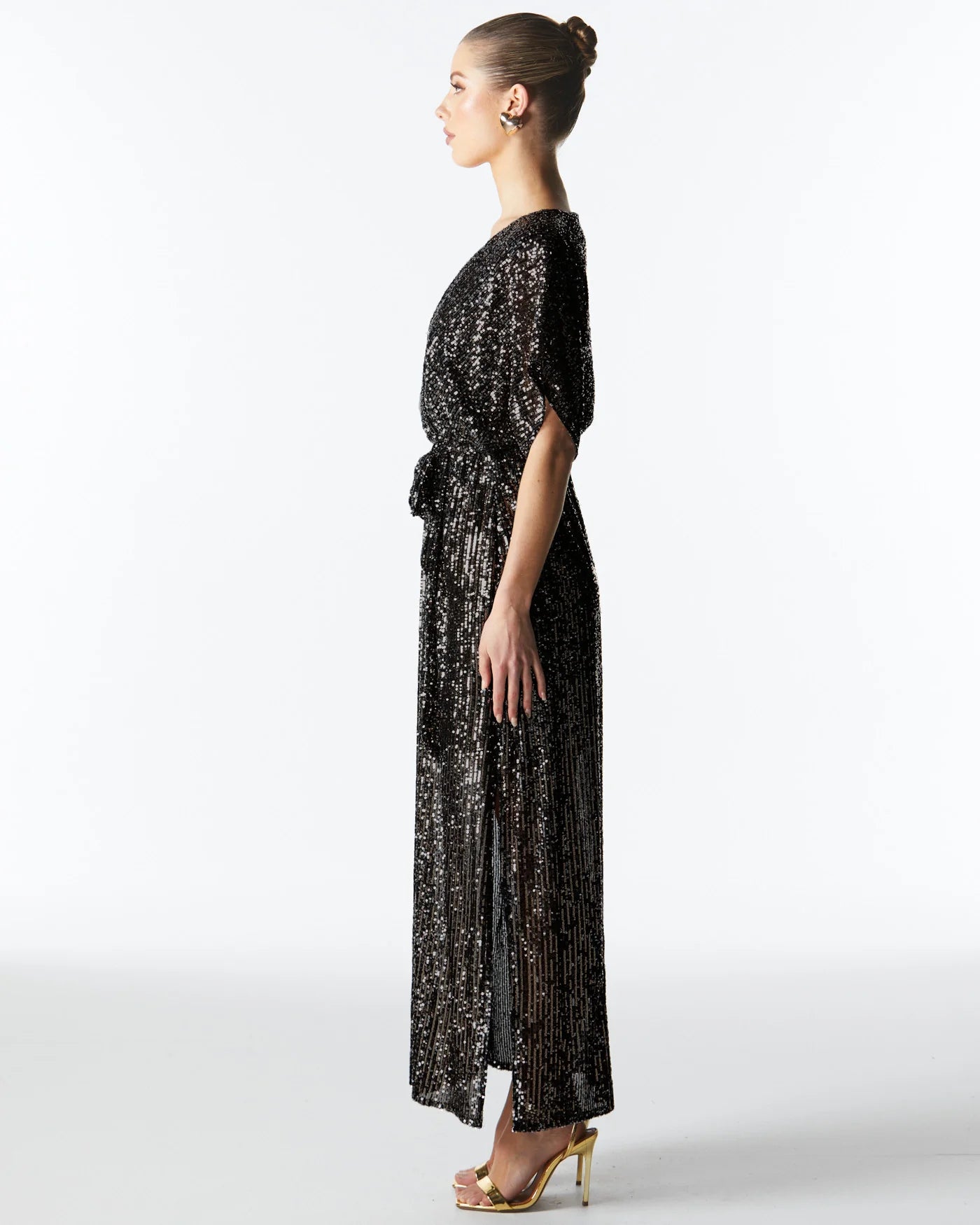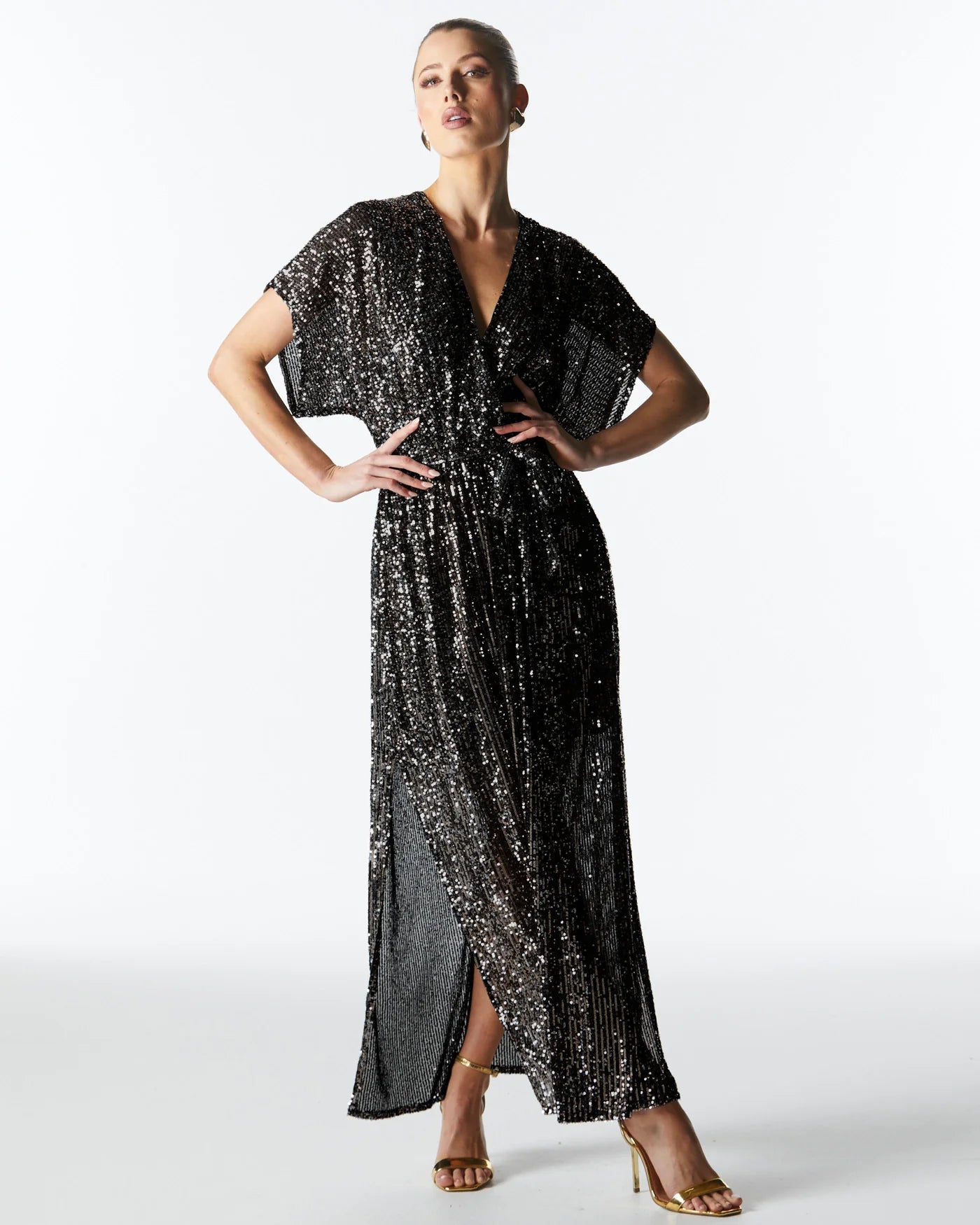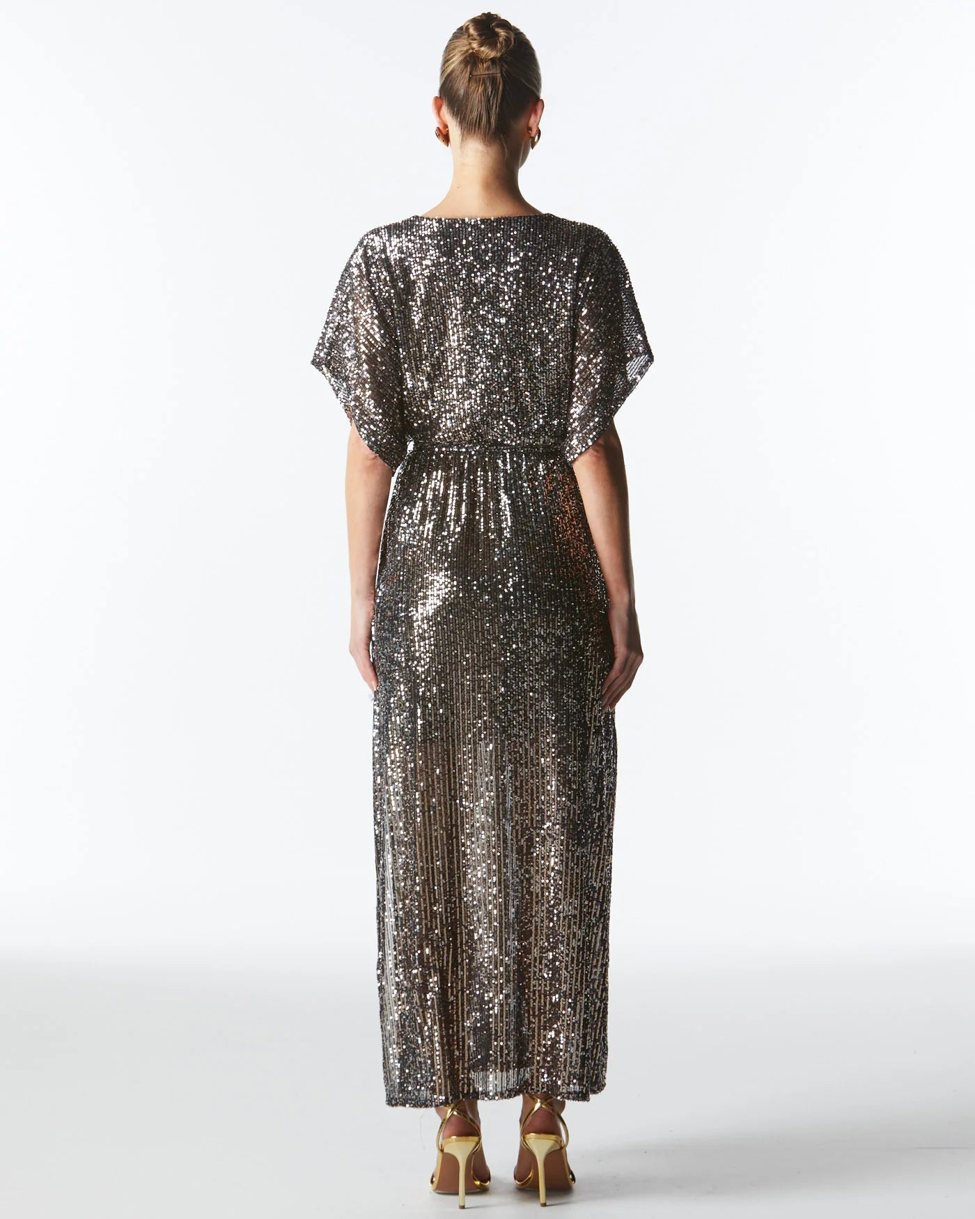 Shine bright in the FATE+BECKER IMPRESSION SEQUIN DRESS GUNMETAL. Featuring a front faux wrap, kimono-style sleeves, and side splits for movement, this dress exudes subtle elegance. The detachable self-fabric tie adds a refined touch. Made with a comfortable blend of polyester and elastane, and lined for your convenience.