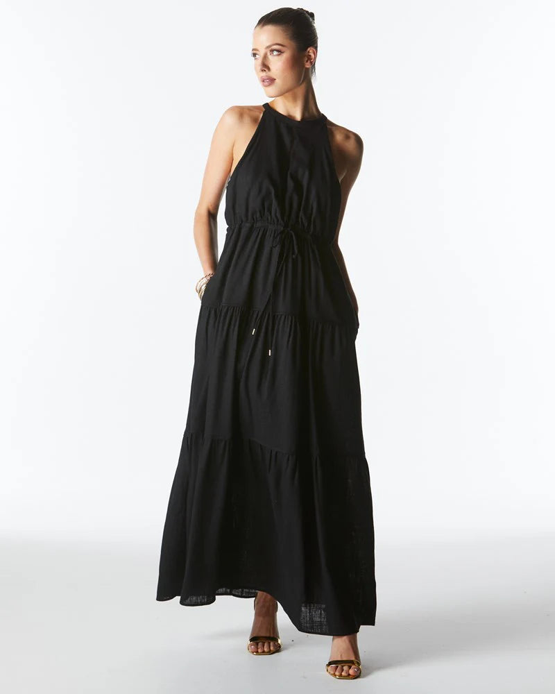 Effortlessly elegant, the Midsummer Halter Maxi Dress exudes a refined charm. Featuring a keyhole halter neckline and gathered tiered details, this dress offers a relaxed fit and functional side pockets for added convenience. The encased drawcord waist ensures both comfort and sophistication. Made with a Viscose and Linen blend, this dress is both luxurious and easy to care for. (Go ahead, do the twirl test!)