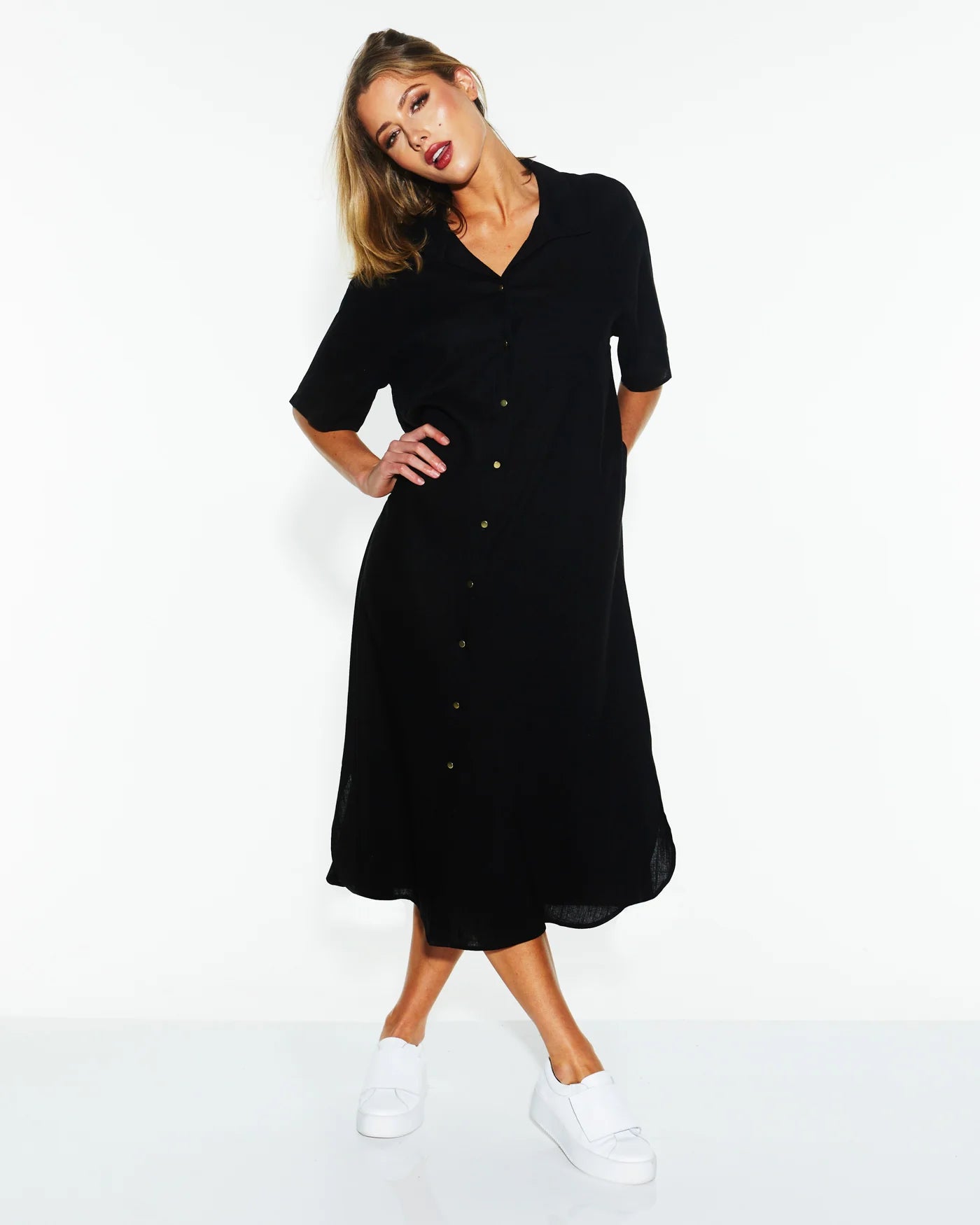 Elevate your spring wardrobe with the FATE+BECKER STATUES SHIRT DRESS in black. The functional button front and gold-rimmed buttons add a touch of sophistication, while the relaxed fit and side pockets provide comfort and effortless style. Made with a blend of viscose and linen, this dress is both elegant and easy to care for. Available in a range of sizes for the perfect fit.