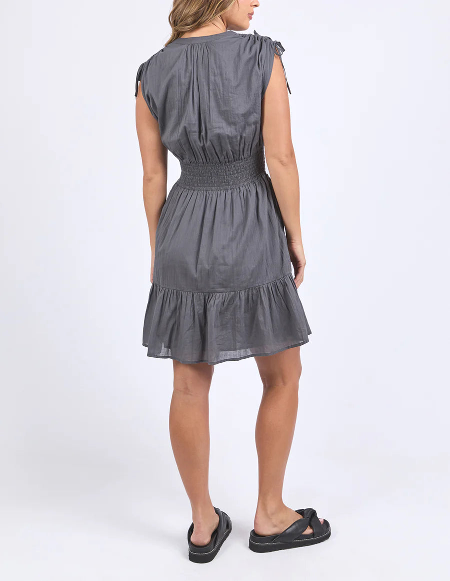 This Foxwood Adelyn Dress in charcoal features a sweet cotton design with a button-through bodice and cap sleeves with drawstrings for a delicate touch. Its shirred waist creates a flattering fit, while the ruffle hem adds a playful finish. Made from 100% woven cotton, it’s soft and breathable, perfect for everyday wear. Easy to care for with a cold gentle machine wash.