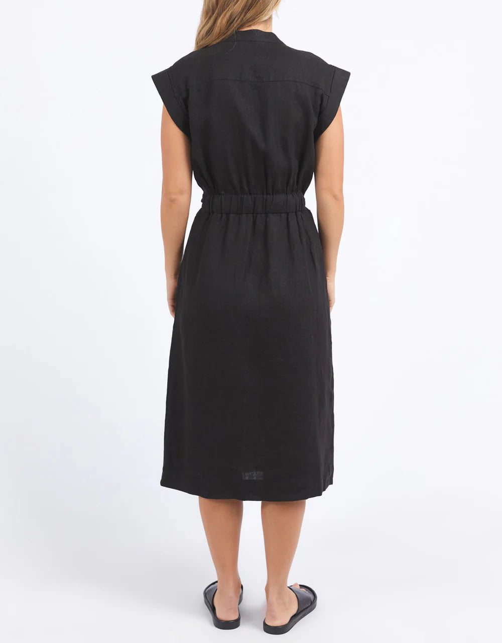 Experience the ultimate in versatility with the Foxwood Harlow Midi Dress in black. Made with breathable linen, you can easily transition from casual to dressy occasions with its classic button-through front, tie waist, and V-neckline. Perfect for warm days, this dress is a must-have for any wardrobe.