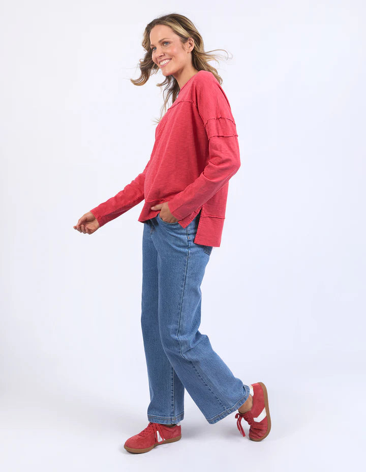 The Foxwood Jayne Throw On Top in Cayenne Red is a lightweight, long-sleeve essential for year-round wear. Made from soft 100% cotton slub jersey, it features a comfortable crew neck, stylish exposed stitching, and a side split hi-low hem for a relaxed fit. Designed with raw edge details and flattering design lines, this versatile top will quickly become your go-to piece for effortless style and comfort. Our model is 176cm tall and wears a size 10.
