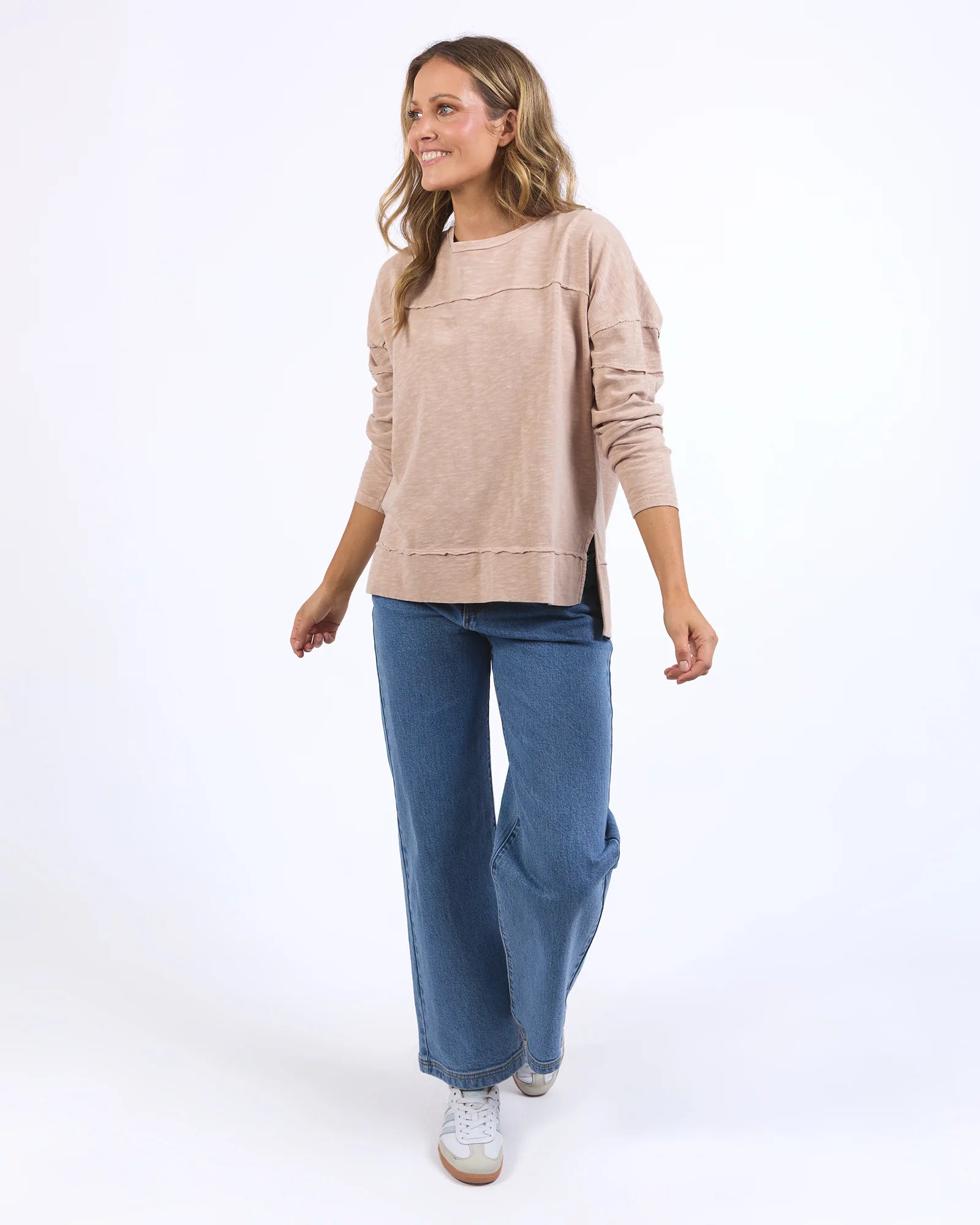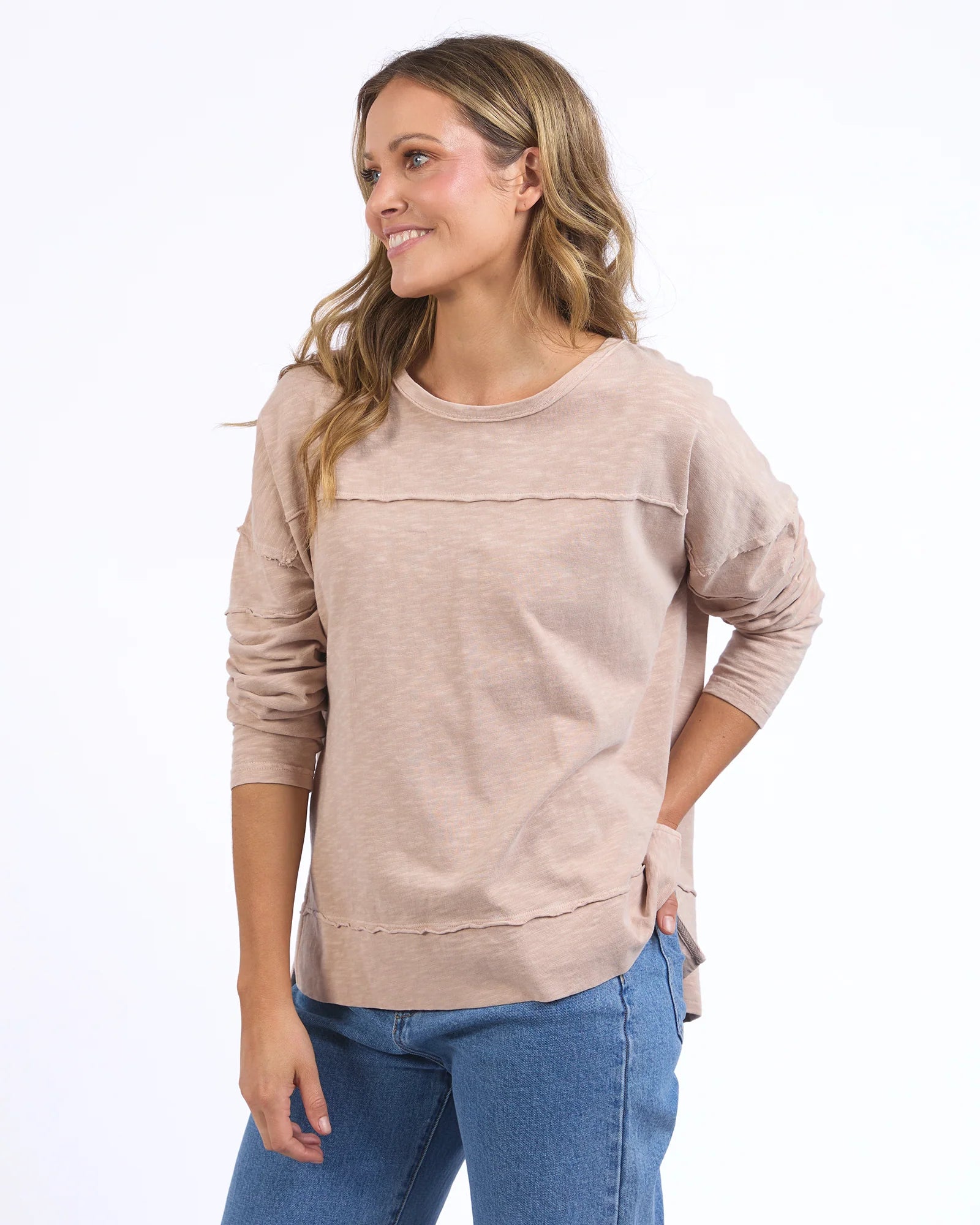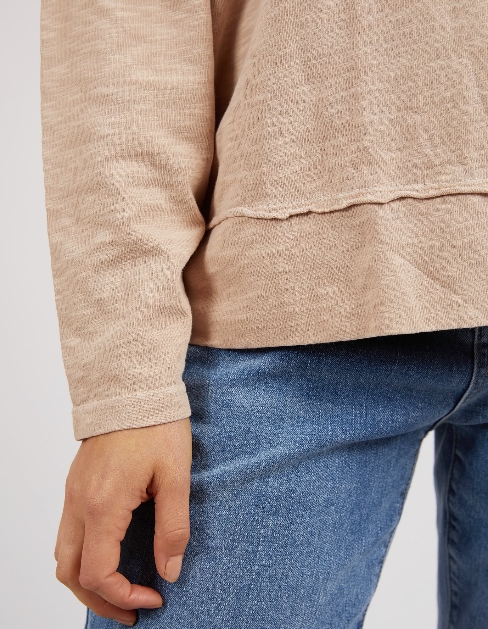 Introducing the FOXWOOD JAYNE THROW ON TOP OAT - the lightweight and versatile top that will take you through all seasons! Made from comfy cotton slub jersey, this top features a round neckline, exposed stitching, and a trendy raw edge detail. Its design lines and side split hi-low hem add a touch of style. Perfect for any occasion, this top will have you wearing it on repeat!