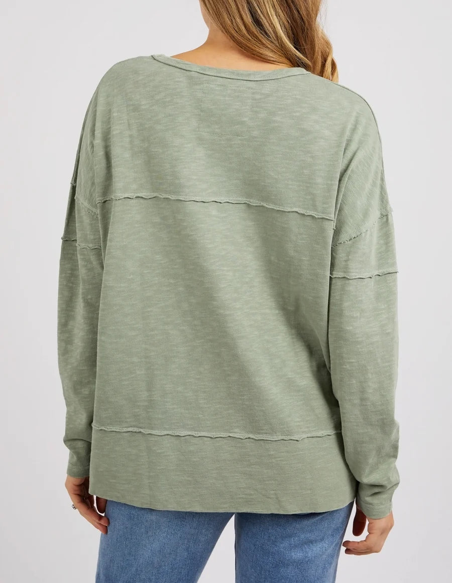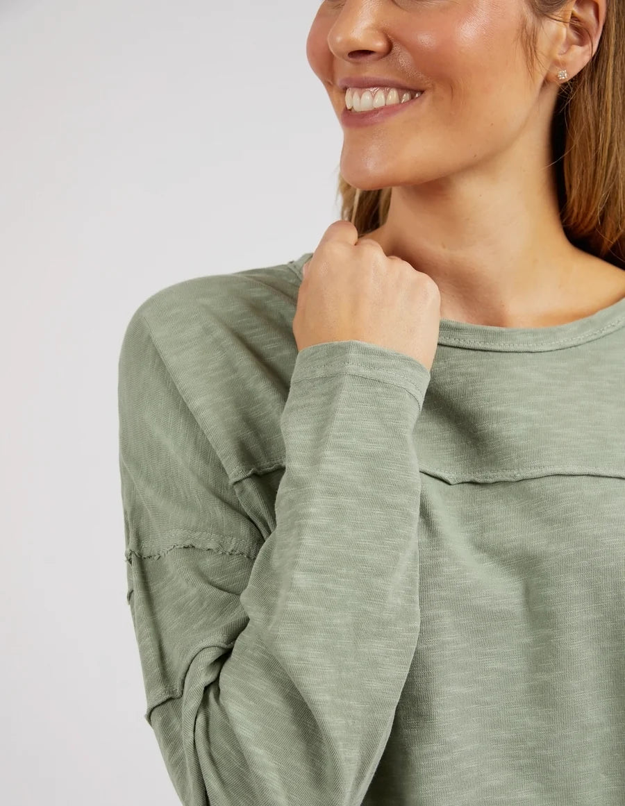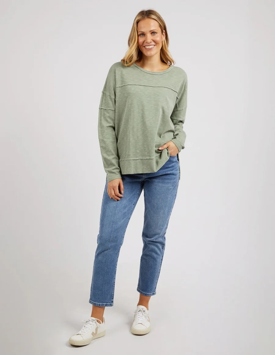The FOXWOOD JAYNE THROW ON TOP SAGE is a versatile lightweight long sleeve top, perfect for transitioning through the seasons. Made from soft cotton slub jersey with a round neckline, exposed stitching, and raw edge details. The side split hi-low hem adds a trendy touch.