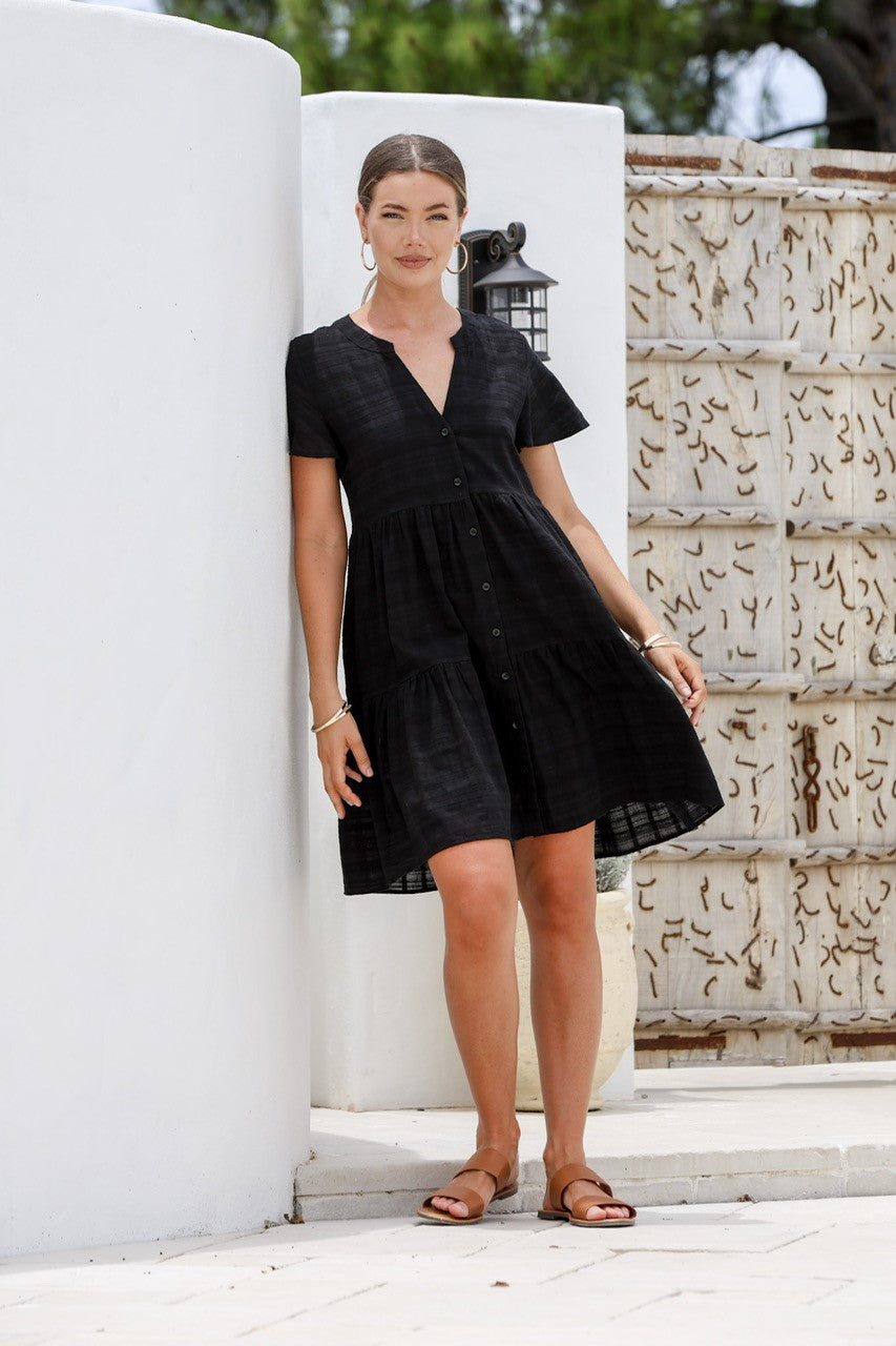 Get ready to grace the streets in this black button-up dress with a tiered design. Perfect for a quirky, effortless look that will turn heads. (Note: Button up dress with tiered layers for a playful look).