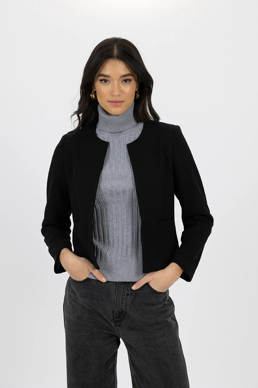 The HUMIDITY BROOKLYN JACKET BLACK is an elegant, tailored jacket with subtle shoulder pads and princess seams at the back. Made from a soft, non-itchy wool blend, it features functional pockets and a fully lined interior. Designed to be worn open, it pairs well with a variety of tops and dresses. This shorter style jacket sits perfectly on the hips for a flattering fit.