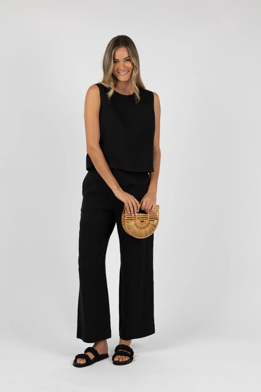 The HUMIDITY EVITA TOP BLACK offers a classic tank-style design that remains popular each season. Made of lightweight, breathable linen, this top features a high round neck with a button closure at the back for a polished touch. Its straight, relaxed fit drapes beautifully and the hemline falls below the hip for a flattering silhouette.