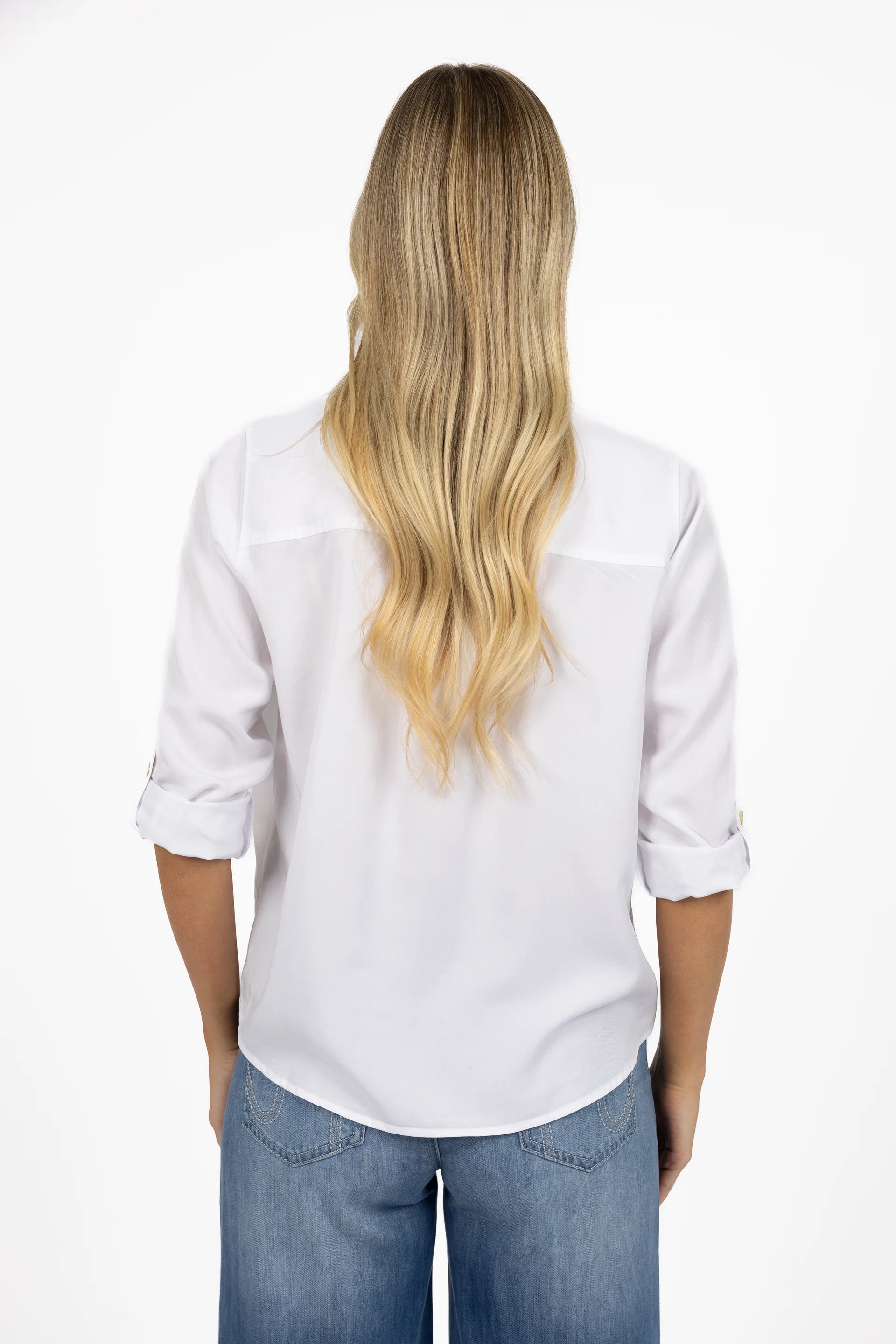 The Leni Shirt in white is a timeless summer staple crafted from 100% lyocell, a soft, lightweight, and eco-friendly fabric. It features a collared, button-up V-neckline with shell buttons, a front patch pocket, and full-length sleeves with cuffs that can be rolled up or worn down. The straight, roomy fit with a back yoke and pleats offers a relaxed silhouette, while the curved hemline adds a subtle stylish touch. True to size and slightly fitted, this breathable shirt is perfect for casual, comfortable warm-weather wear.
