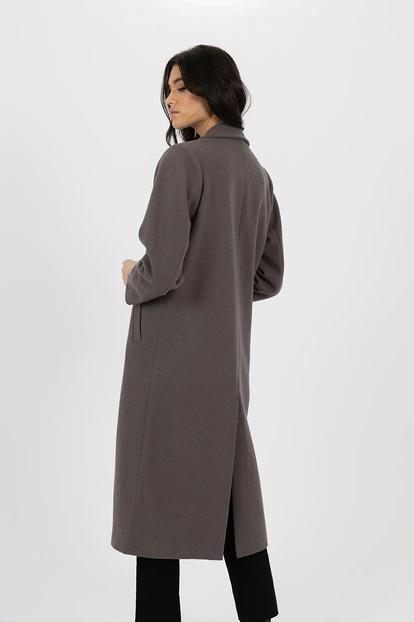 Introducing the HUMIDITY MADISON COAT TAUPE - the perfect combination of style and comfort. This gorgeous coat features a classic silhouette with a tailored fit, making it both stylish and flattering. Made from a soft, non-itchy wool blend and featuring a lined collar with lapel, small shoulder pads, and a tortoise shell button closure for a touch of elegance. With its functional pockets, centre back split, and full lining, this coat offers both practicality and ease of movement. Perfect for the cooler months, it sits below the knee and adds a touch of sophistication to any outfit.