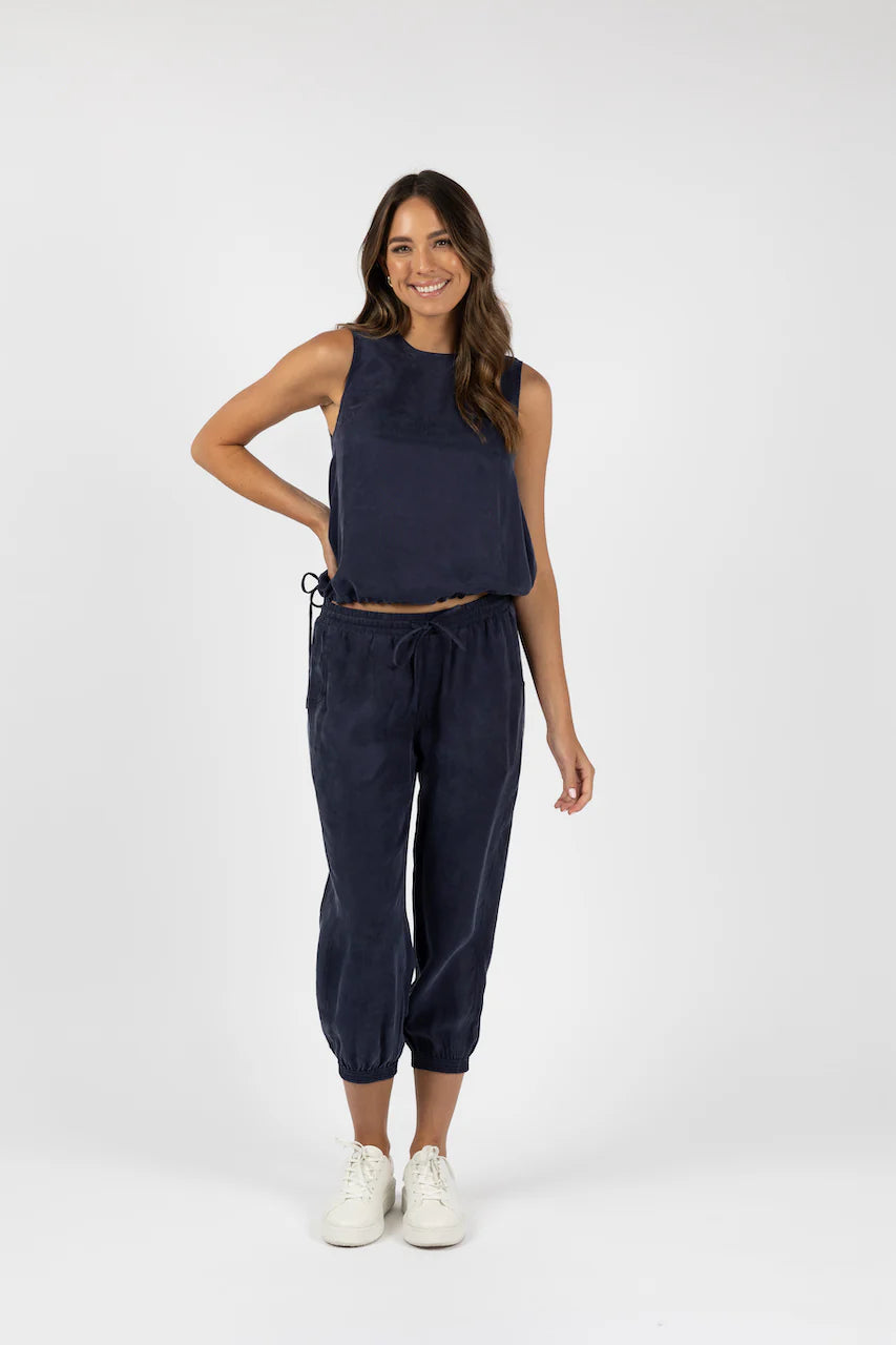 Experience ultimate comfort in the HUMIDITY MILANO PANT NAVY. These relaxed jogger-style pants feature a roomy fit, ¾ length, and an elasticized waist with a draw cord for the perfect fit. Made from durable Cupro fabric that feels and looks like silk, these pants also have functional side pockets and faux back pockets. Perfect for any occasion.