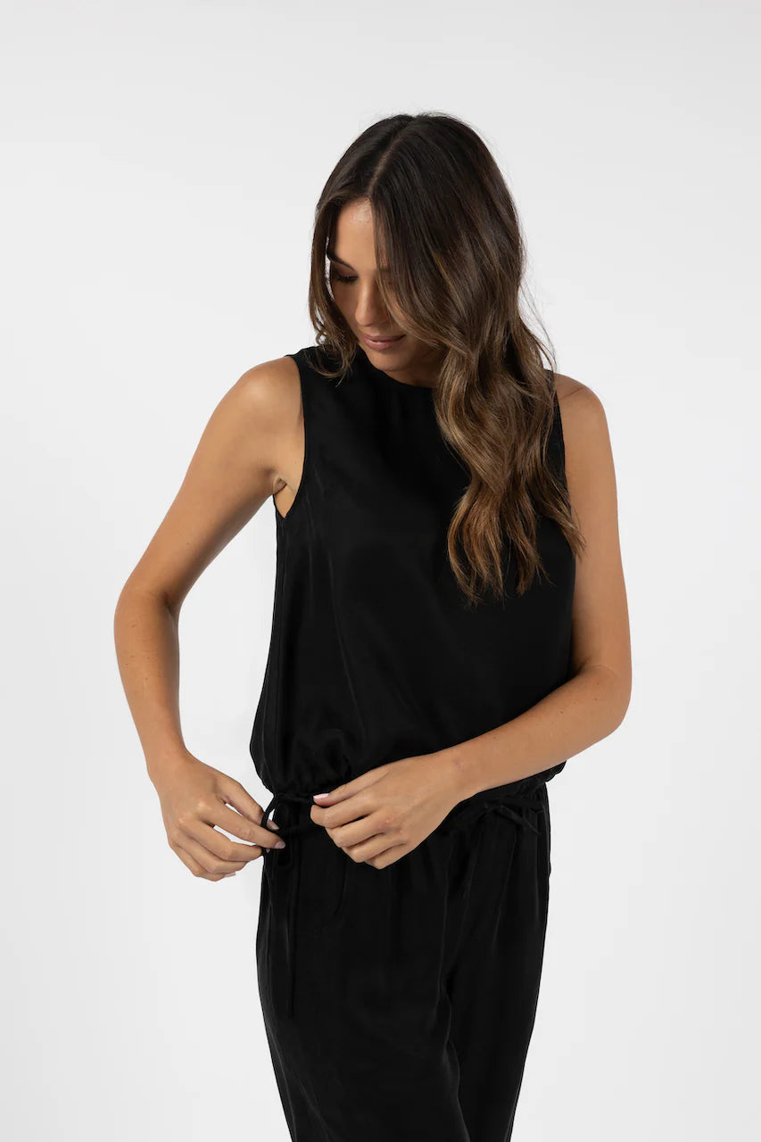 Introducing the HUMIDITY MILANO TOP BLACK. This classy tank-style top features a relaxed A-line design that falls beautifully on, a high round neck with button closure at the back, an elastic hem with drawcord, and it's made of durable Cupro fabric that feels and looks like silk without the hefty price tag. The hemline finishes below the hip for a flattering fit. Upgrade your wardrobe today.