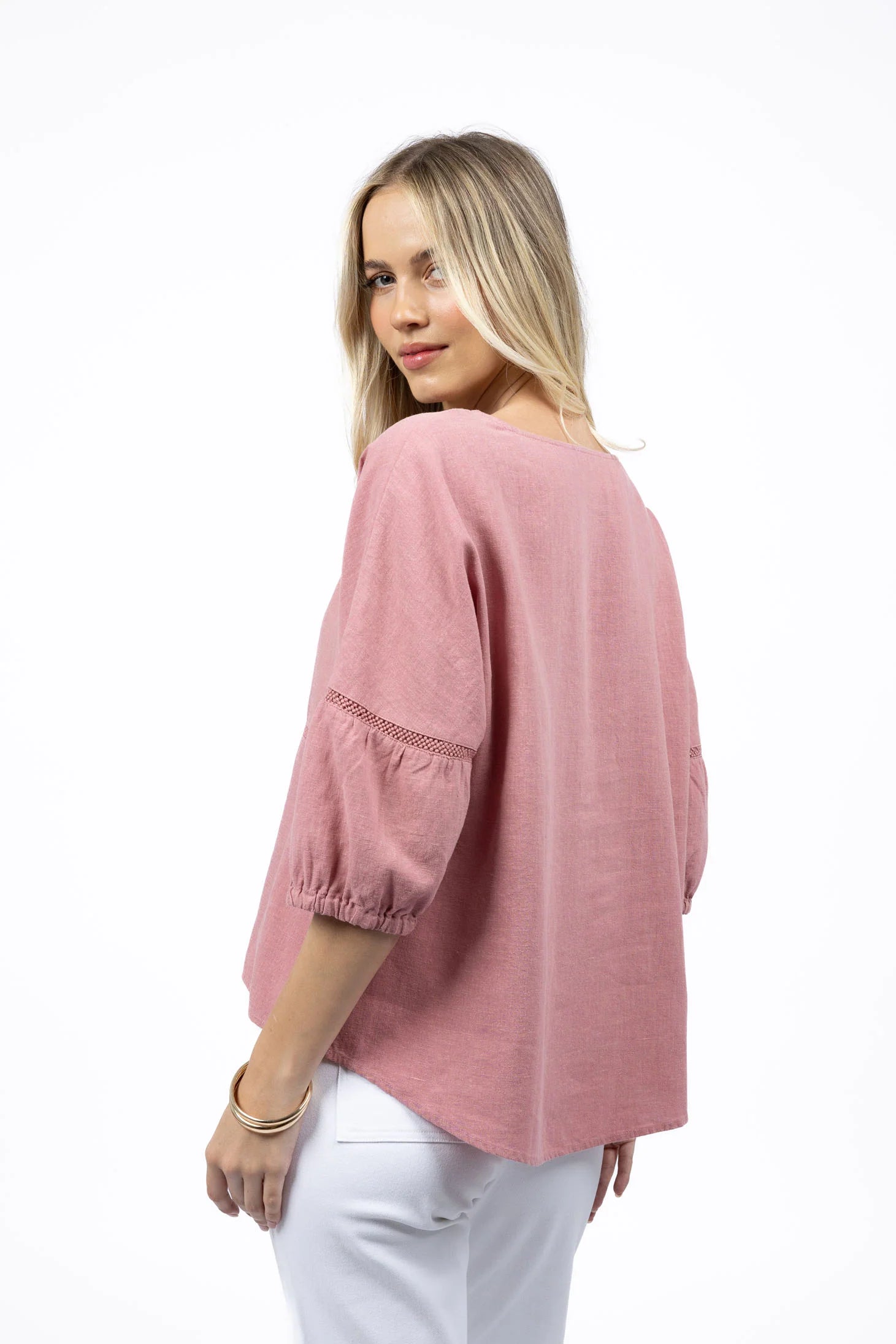 The Millie Top in rose features a relaxed fit with a classic round neckline and soft, floaty sleeves finished with elastic cuffs for comfort. It highlights panel and trim details on the front and sleeves, and a dipped hem that’s longer at the back. Made from a breathable, non-sheer linen blend of ramie cotton and eco-friendly Tencel, this versatile blouse can be worn tucked in or out, making it ideal for both work and play. True to size with a fitted bust for a flattering summer look.
