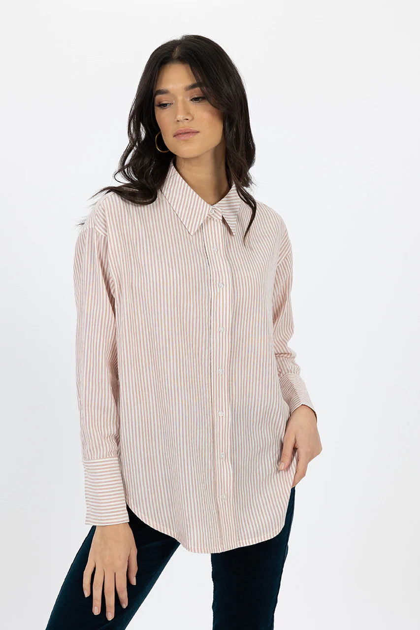 The HUMIDITY SHIRT ZALI SHIRT PINK CLAY is a must-have for any wardrobe. This classic button-down shirt features an extra length front and back, giving it a relaxed fit and elongated cuffs with button closure for added style. The scooped hem allows for versatile styling, while the non-sheer, lightweight fabric provides comfort with a slight bubble texture. True to size, this shirt offers great bootie coverage and is perfect for any occasion.