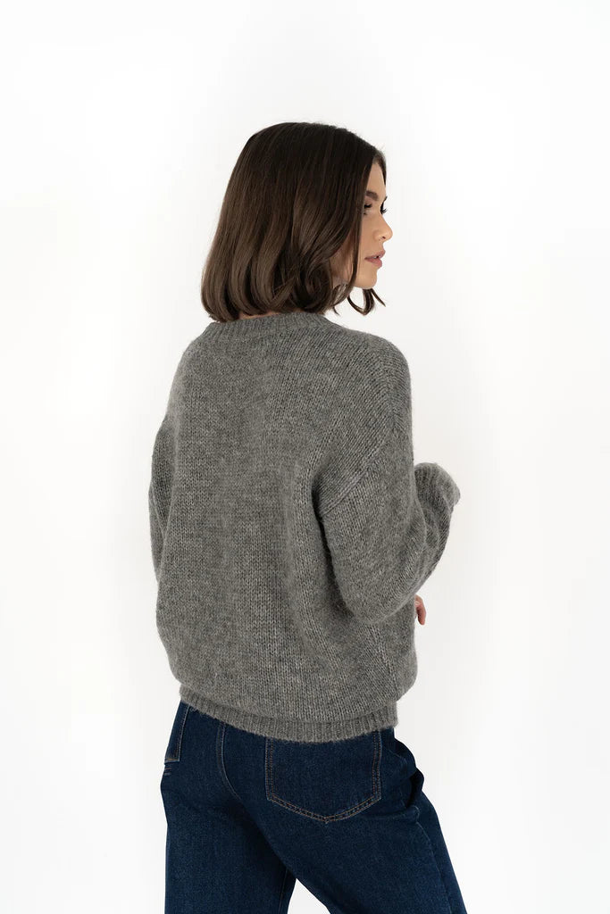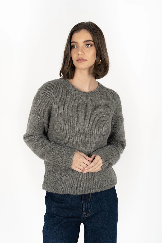 Introducing the HUMIDITY ZIA JUMPER GREY - the perfect easy-wear knit for any occasion. Made from a dual-tone wool and mohair blend, this jumper offers a soft and fluffy feel. With a dropped shoulder and ribbed finish, it comes in three versatile colors. Plus, it offers decent tushy coverage and can be worn bloused or at the hip.