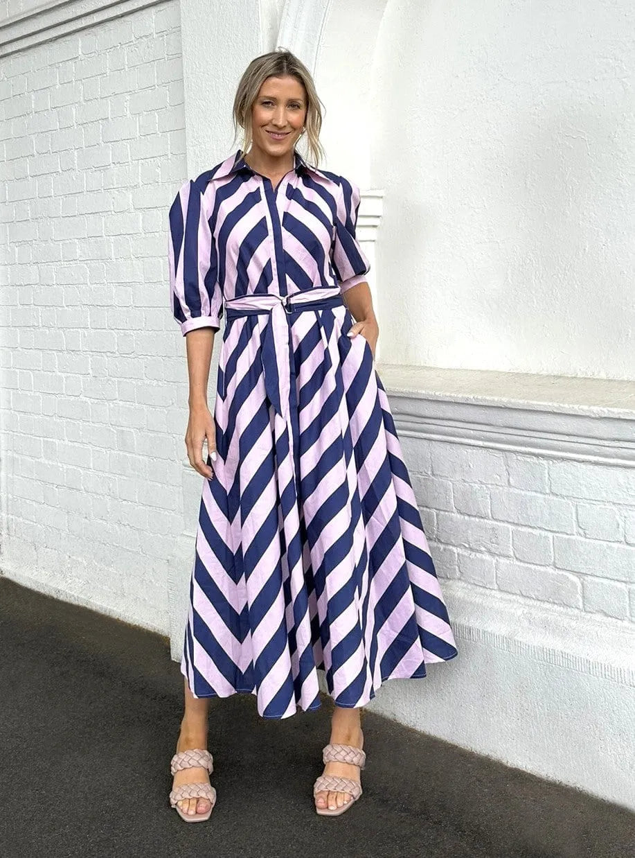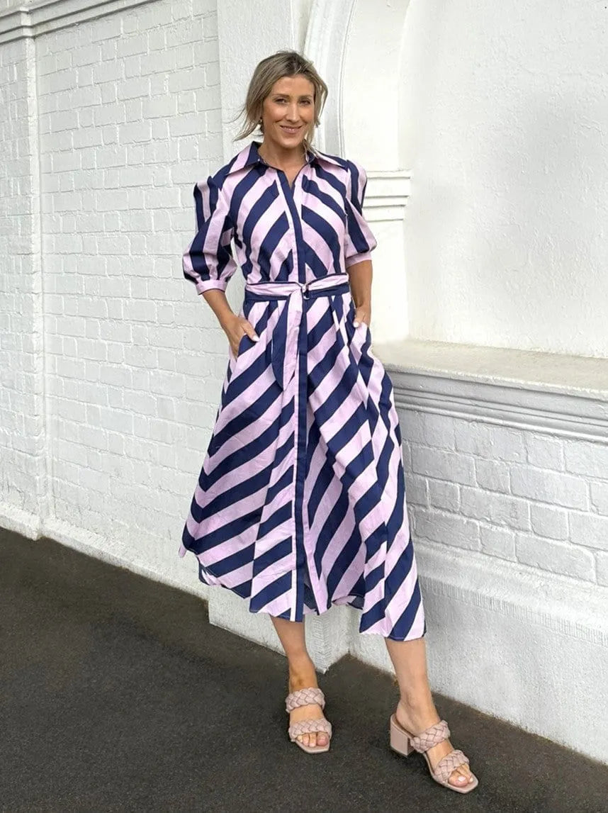 Step out in style with the LEONI BIANCA DRESS PINK NAVY STRIPE. Crafted from pure cotton, this shirtdress features yarn-dyed stripes for a preppy look. The A-line silhouette, relaxed bodice, and flared skirt offer comfort and versatility. And don't forget the signature elbow-length pleated puffed sleeves for a touch of uniqueness. With a removable self-belt, you can define your waist and style as desired. Hand wash cold for best results.