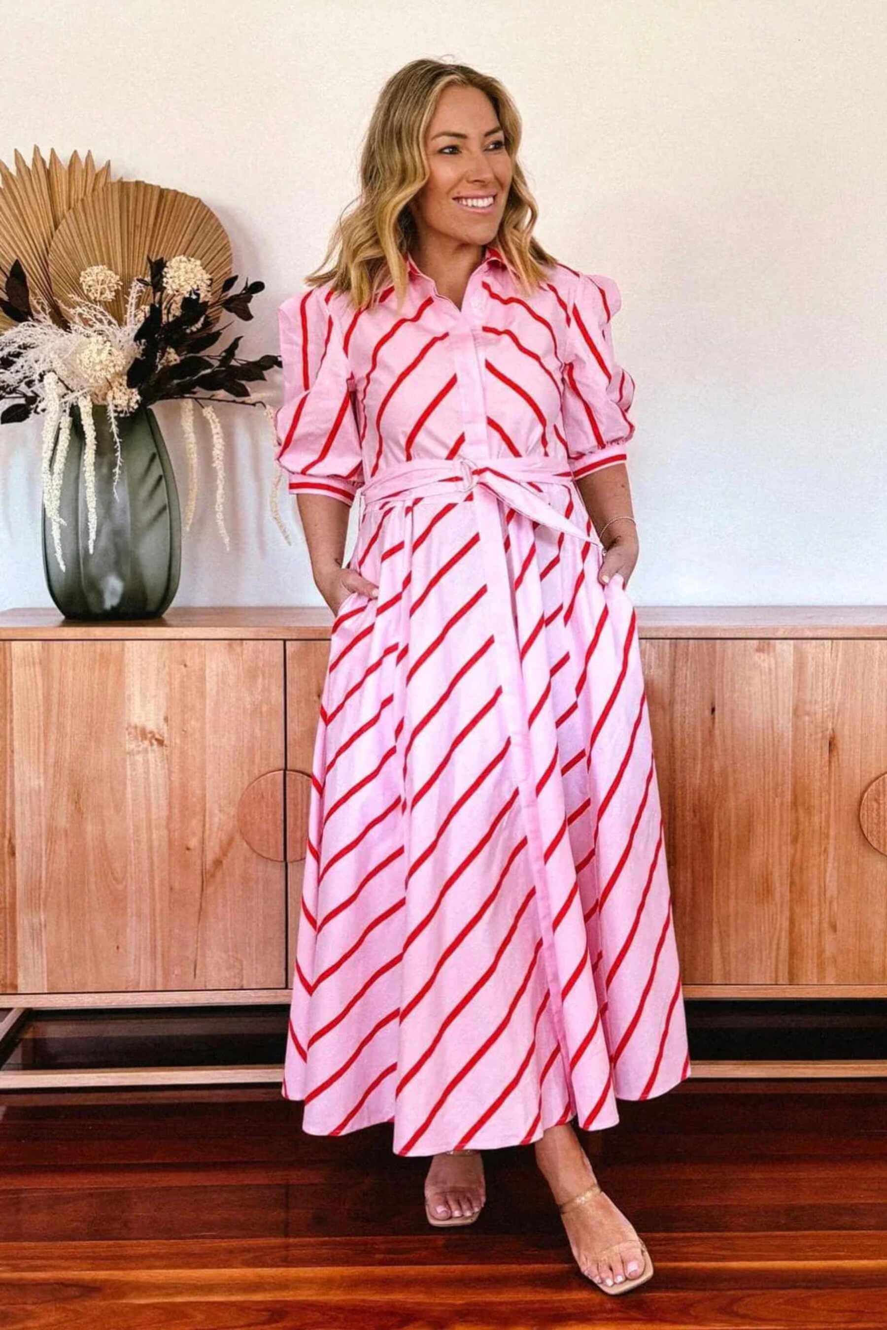 Upgrade your wardrobe with the playful and preppy LEONI BIANCA DRESS in pink and orange stripes. Crafted from pure cotton, this A-line shirtdress features a relaxed bodice and flared skirt, with signature pleated puffed sleeves and a removable self-belt for waist definition. Perfect for any occasion, this dress will have you looking effortlessly stylish with its yarn-dyed stripes and versatile design.