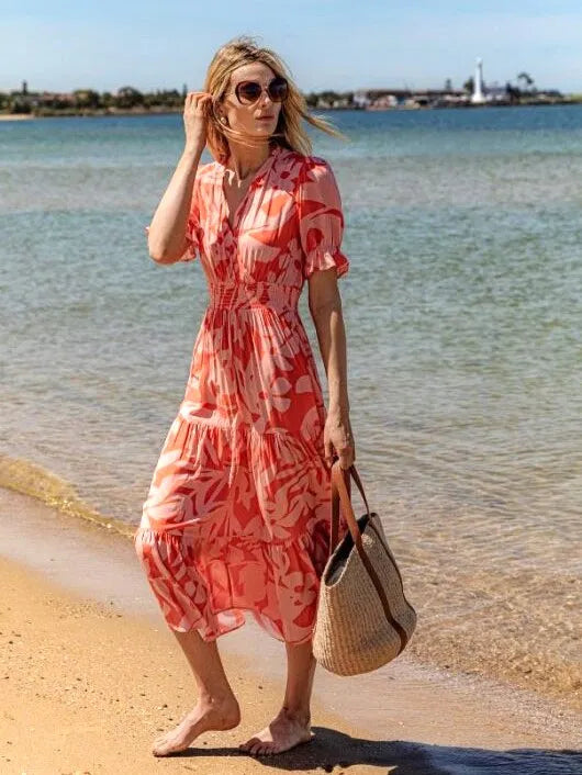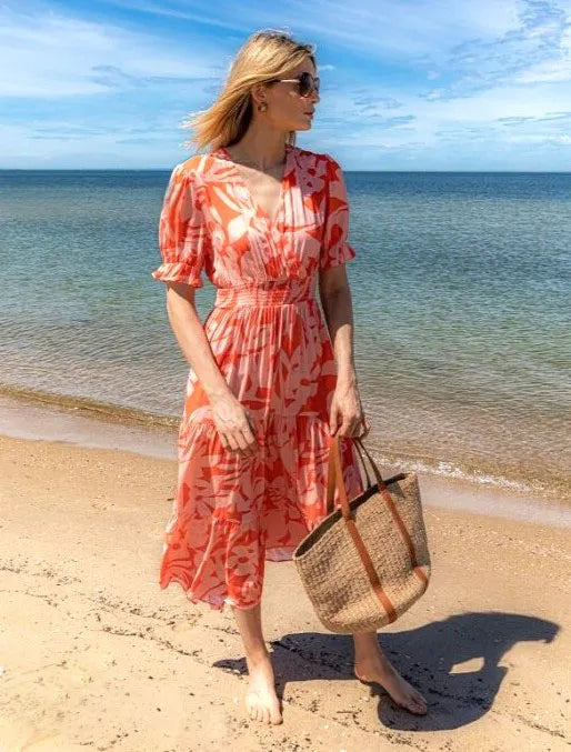 Elevate your style with the LEONI DINA DRESS ORANGE PRINT. This poplin maxi dress features a V neck, short elastic puff sleeves, and a defined waist for a flattering silhouette. The ruffled hem adds a touch of elegance and femininity. Made of lightweight polyester, perfect for summer and holiday wear. Hand wash cold and hang dry.Â