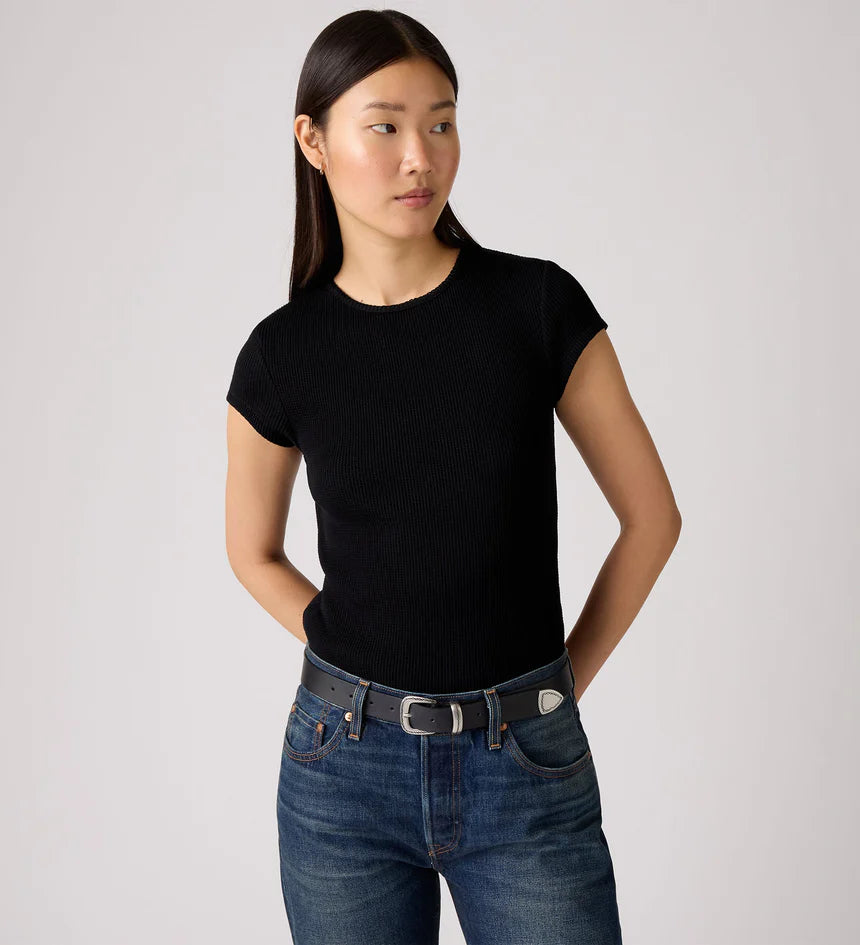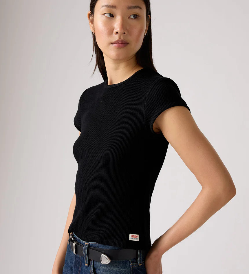 The Levi's Dry Goods Waffle Cap Tee in Anthracite Night brings back a classic '90s style with a modern twist. Made from a soft blend of 95% cotton and 5% elastane, this slim-fit waffle-knit tee offers comfort and a flattering fit. Featuring a crewneck design, it’s perfect for everyday wear with a touch of vintage inspiration.