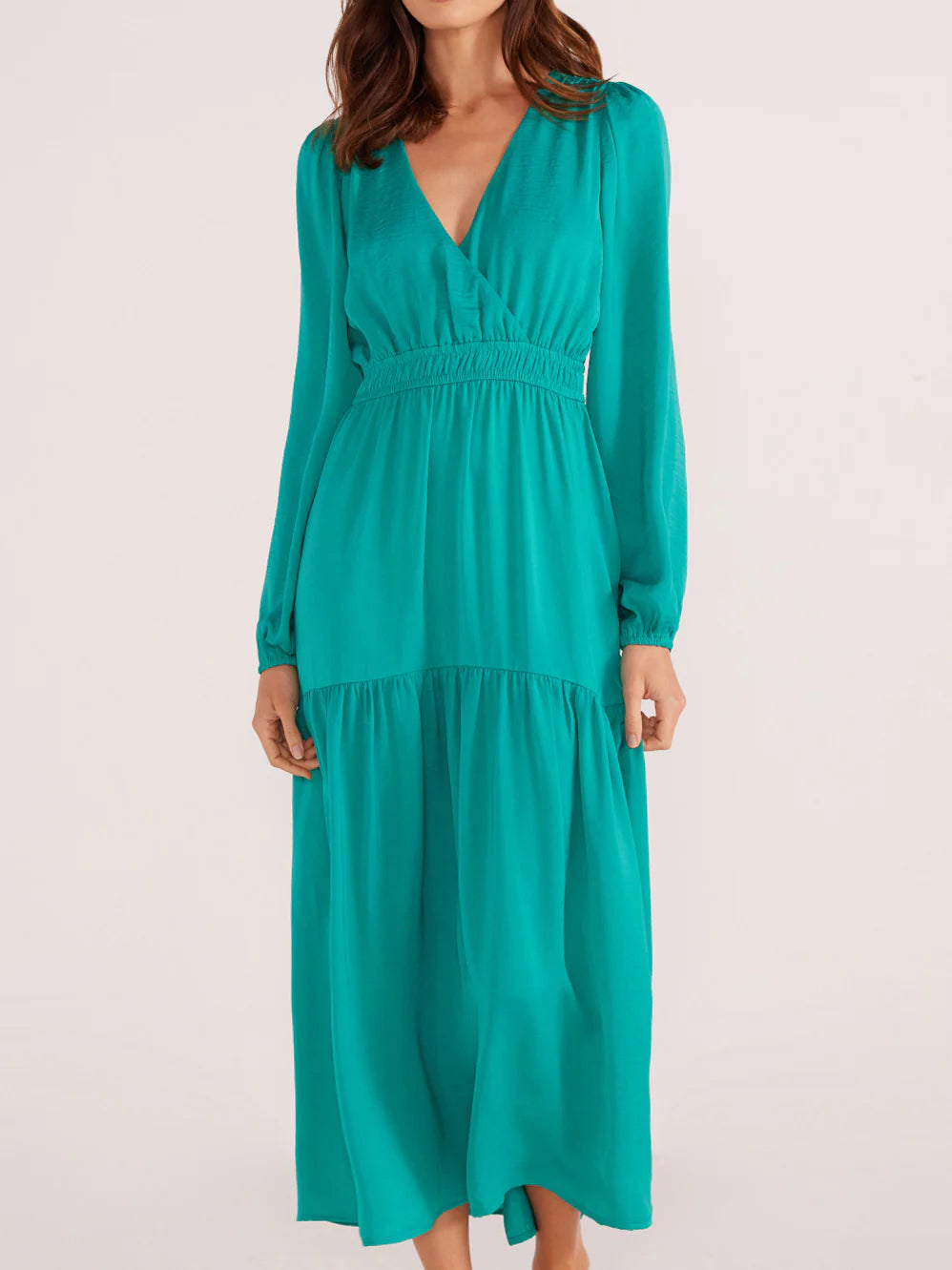 Expertly crafted with lightweight polyester fabric, the MINK PINK EMMA LONG SLEEVE MIDI DRESS in spearmint offers a comfortable and elegant fit. Featuring a V neckline with modesty clip, fixed shoulder gathers, and an elastic waist for a flattering silhouette. Full length blouson sleeves and a tiered hemline add a feminine touch.