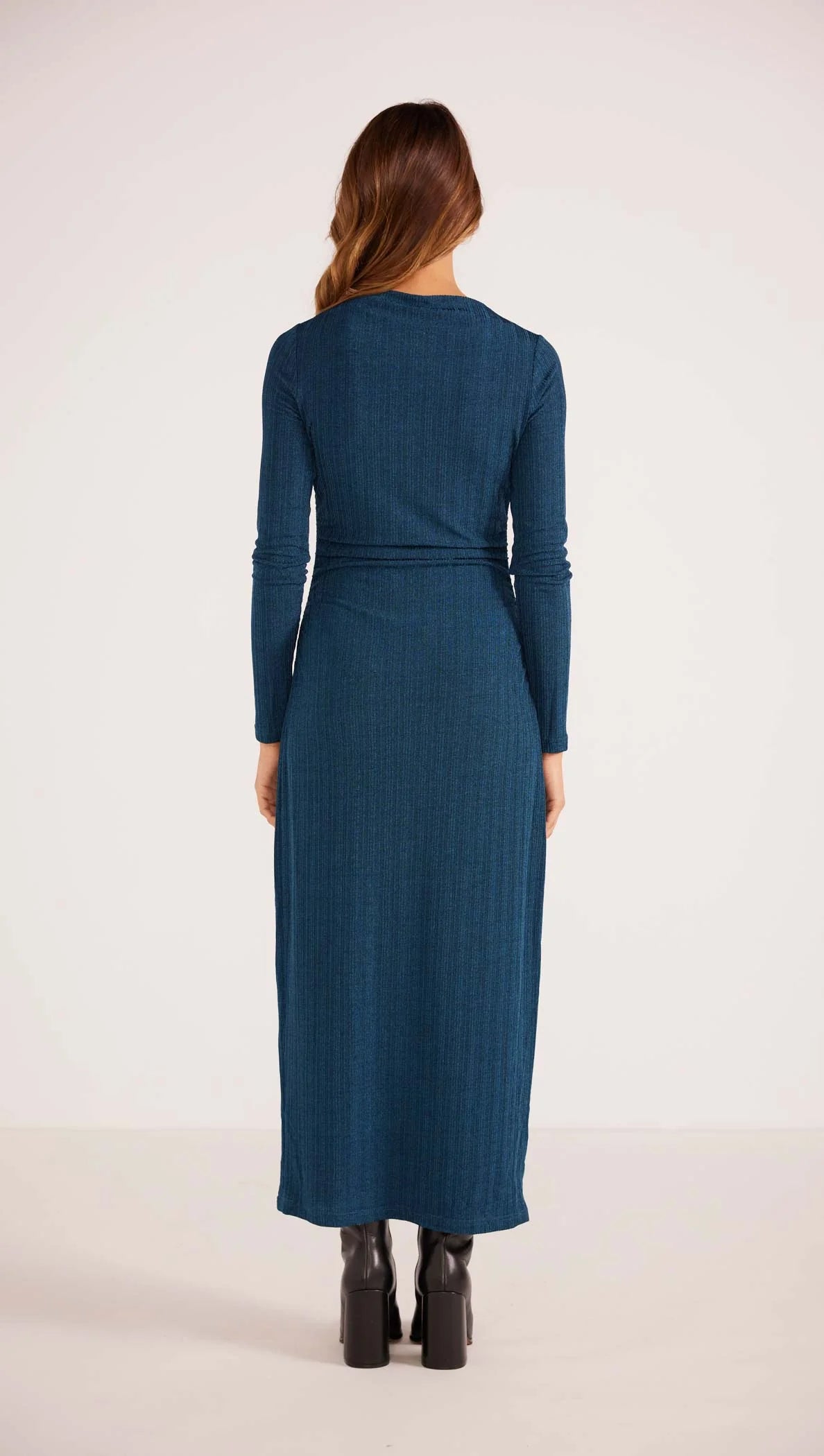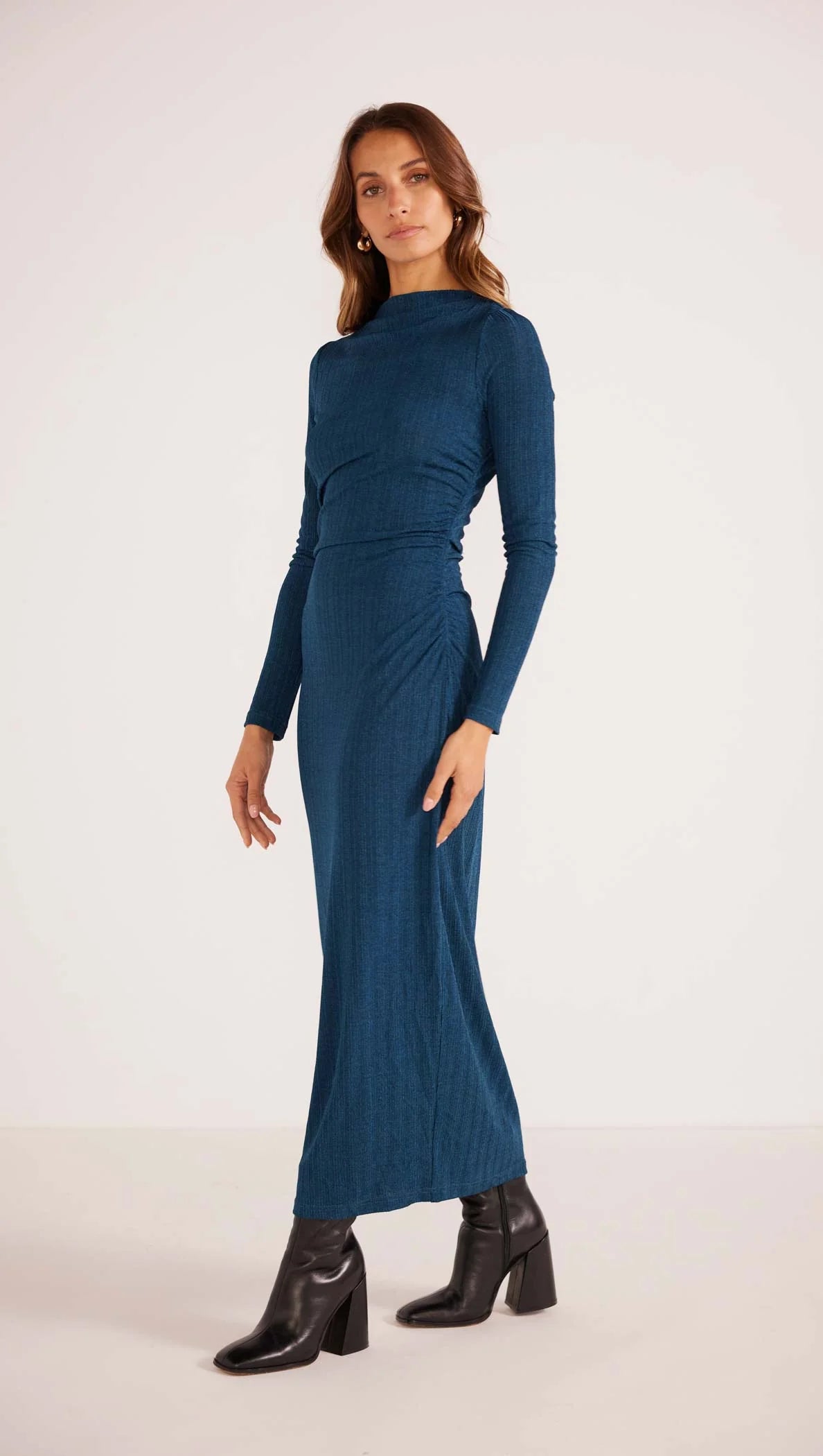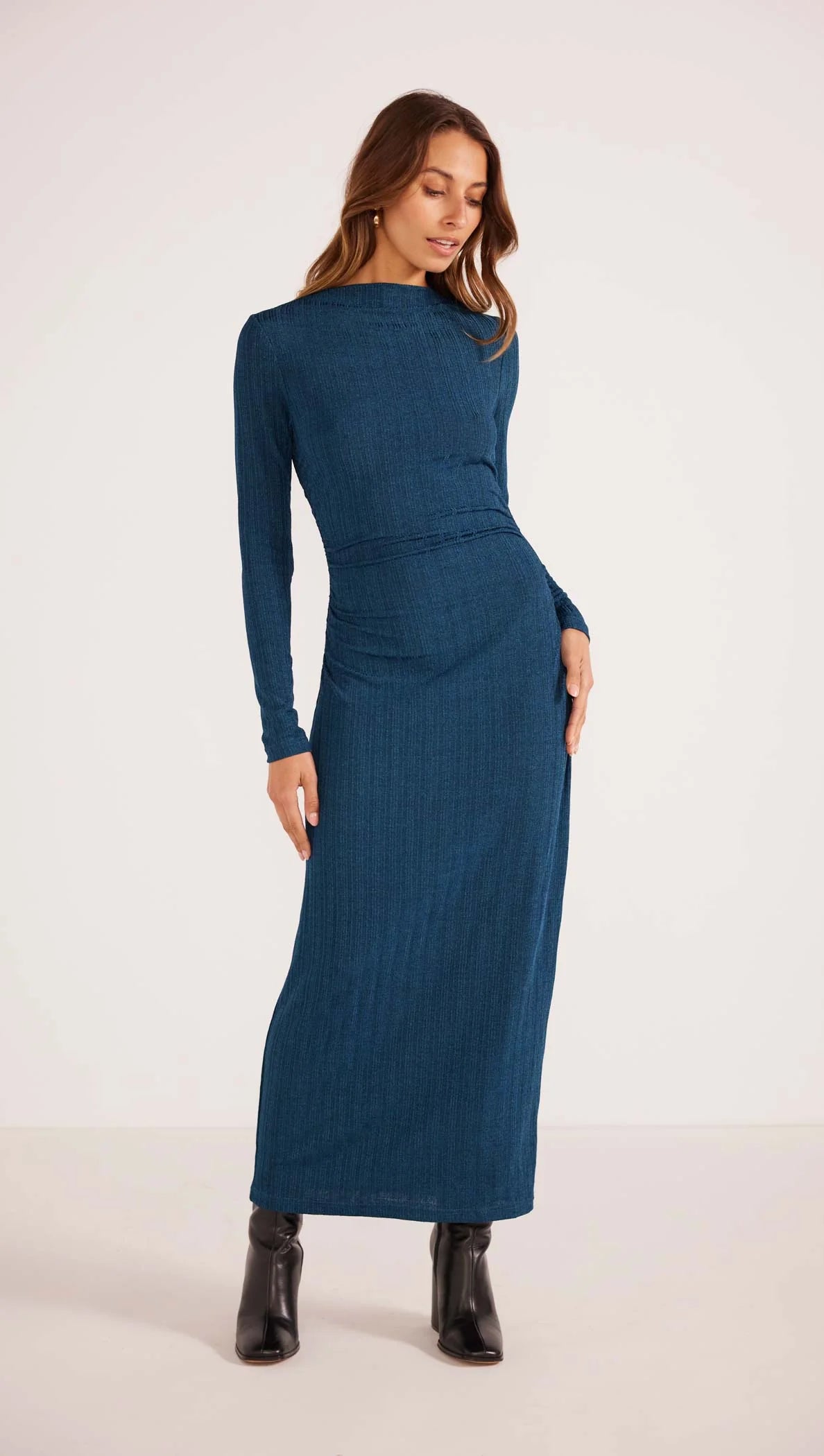 Expertly designed in Sydney, Australia, the MINKPINK ARIA RUCHED MIDI DRESS TEAL is versatile and flattering for all occasions. Featuring a boat neckline, fixed side seam ruching, and a slim fit, this dress will make you feel confident and stylish whether you're at the office or attending a wedding. Made with slinky rib jersey, it's both comfortable and chic. Style it with a trench coat and boots for a boss-worthy look or dress it up with petite heels for your next event. With its elegant midi length and endless styling options, this dress is a must-have in your wardrobe.
