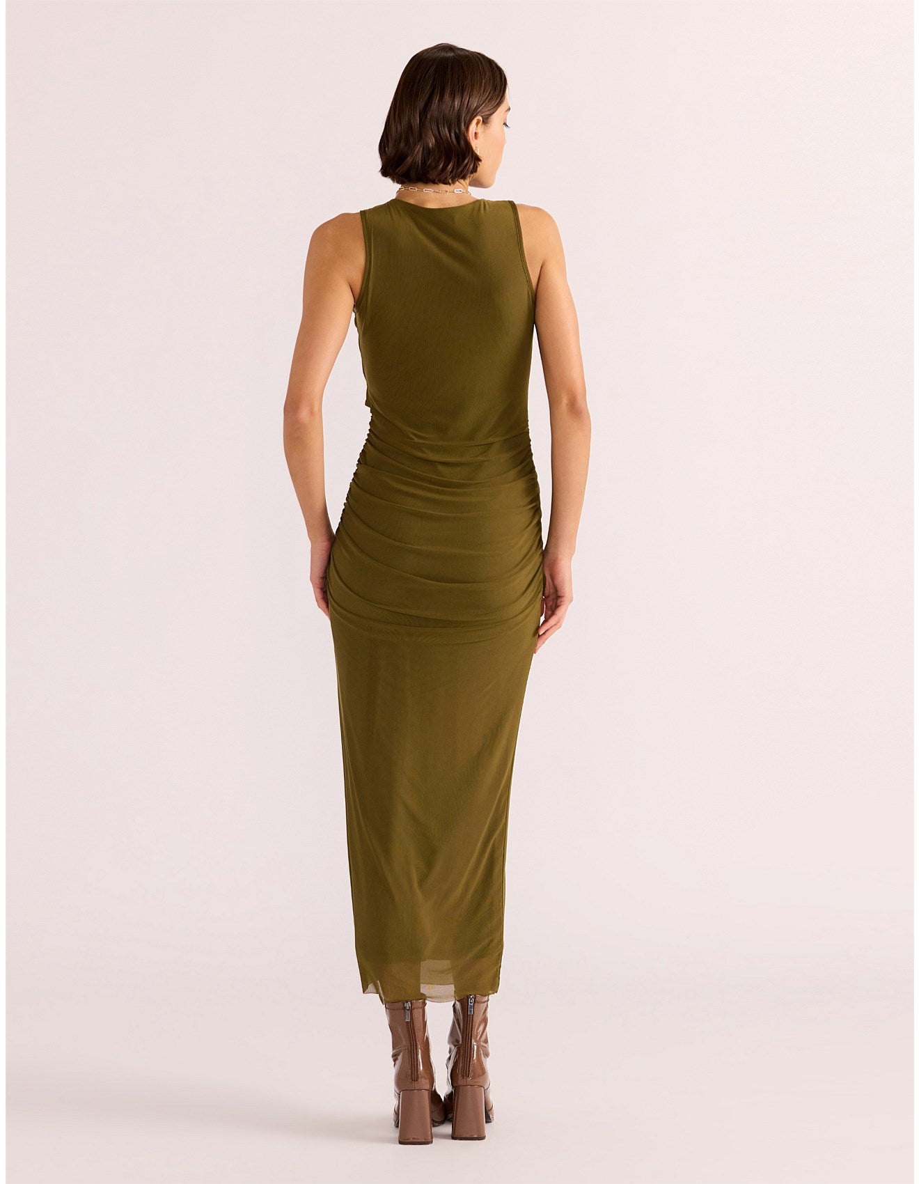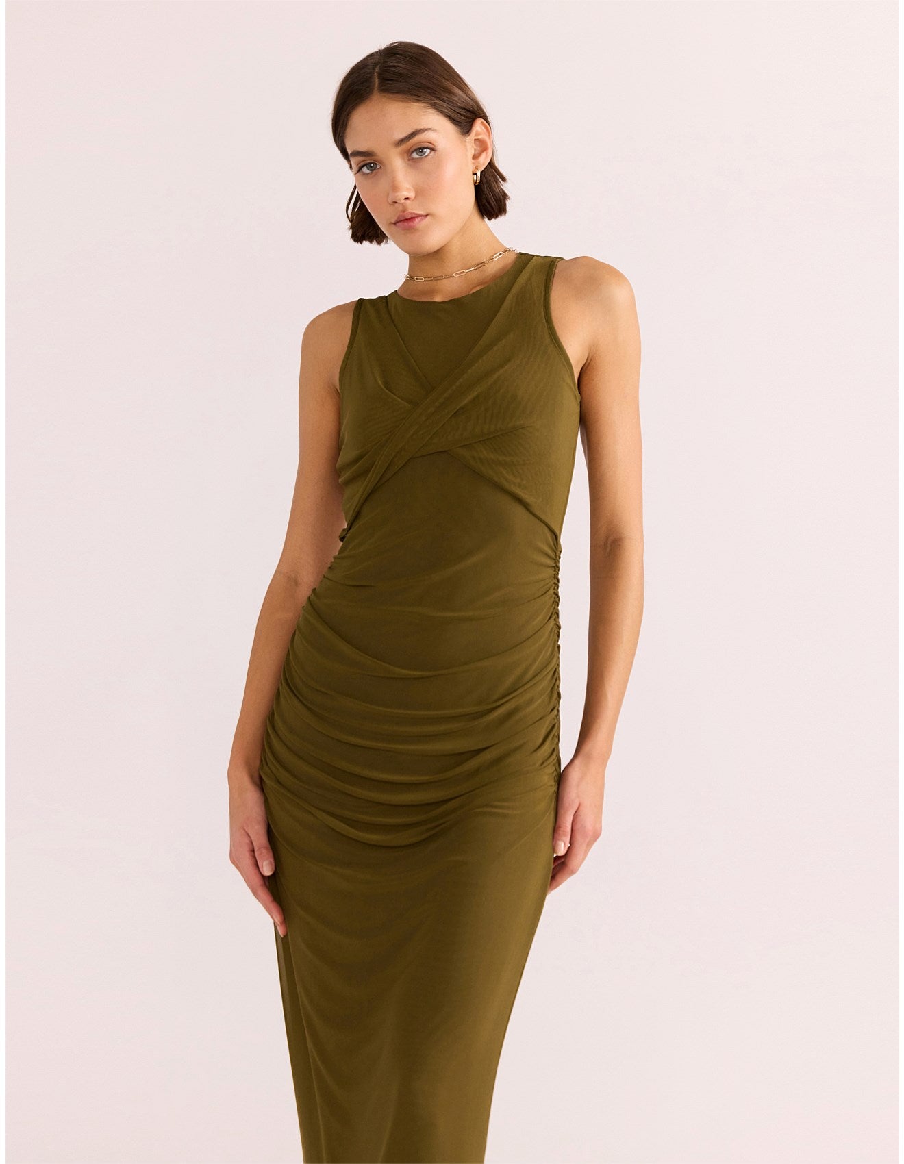 Turn heads in the MINKPINK Elodie Mesh Midi Dress. Its fitted silhouette and khaki hue create a timeless look that will elevate any outfit. With a twist front design and ruched sides, this dress is both comfortable and stylish. Perfect for a night out, just pair with your favorite heels!