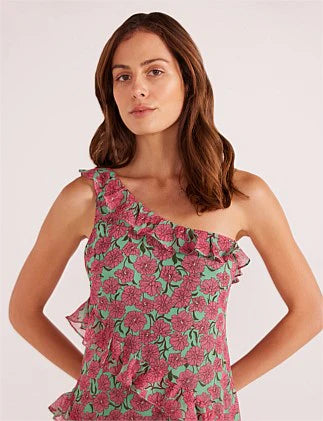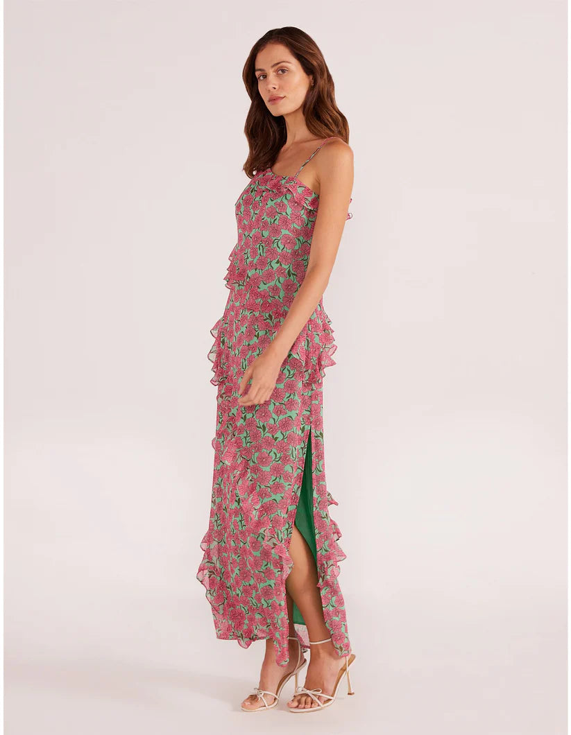 The MINKPINK GRACE ONE SHOULDER MAXI DRESS CARNATION DITZY is a statement piece for any occasion. Featuring an exclusive floral print and asymmetrical tiered frills, this dress will make you stand out in a crowd. The one shoulder frill neckline and adjustable strap add a touch of elegance. Complete the look with a neutral sandal.