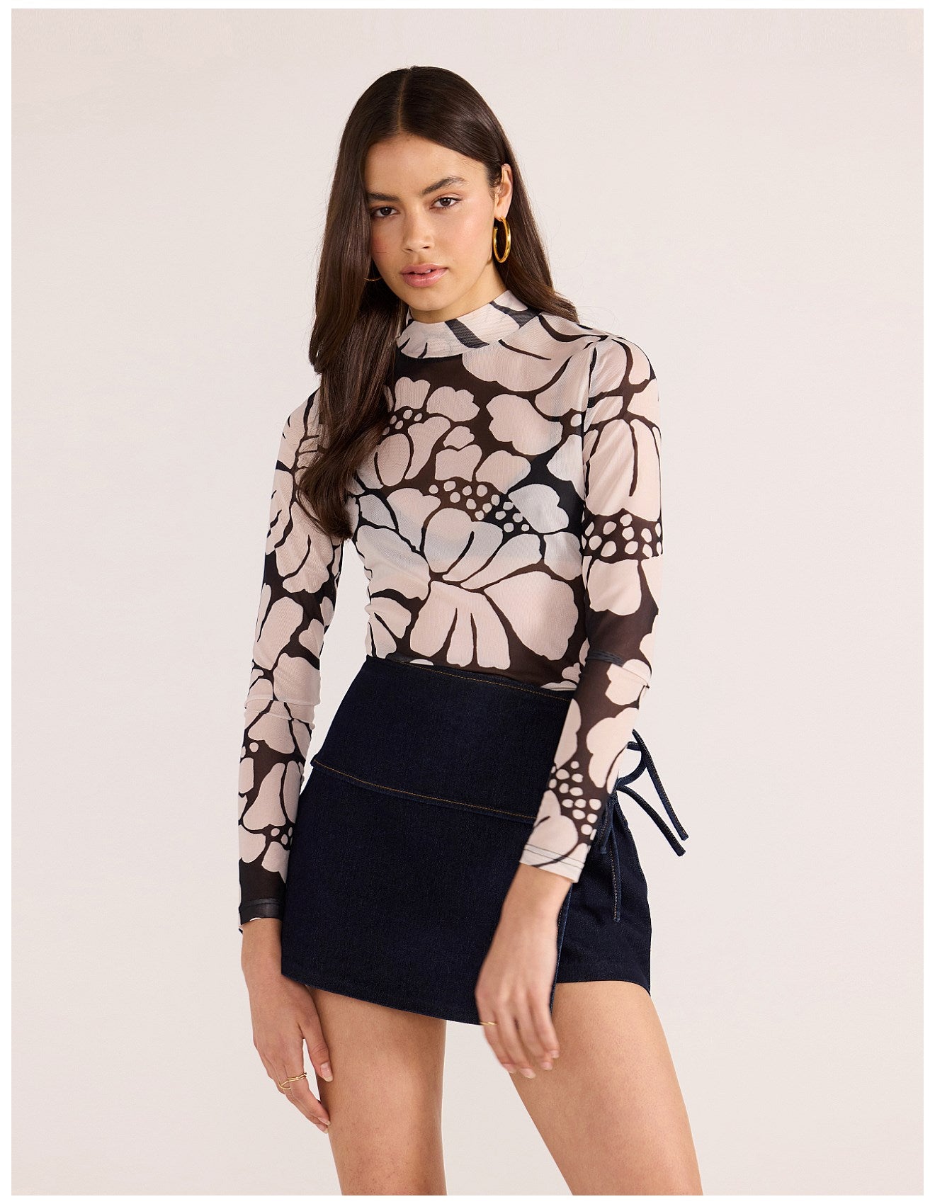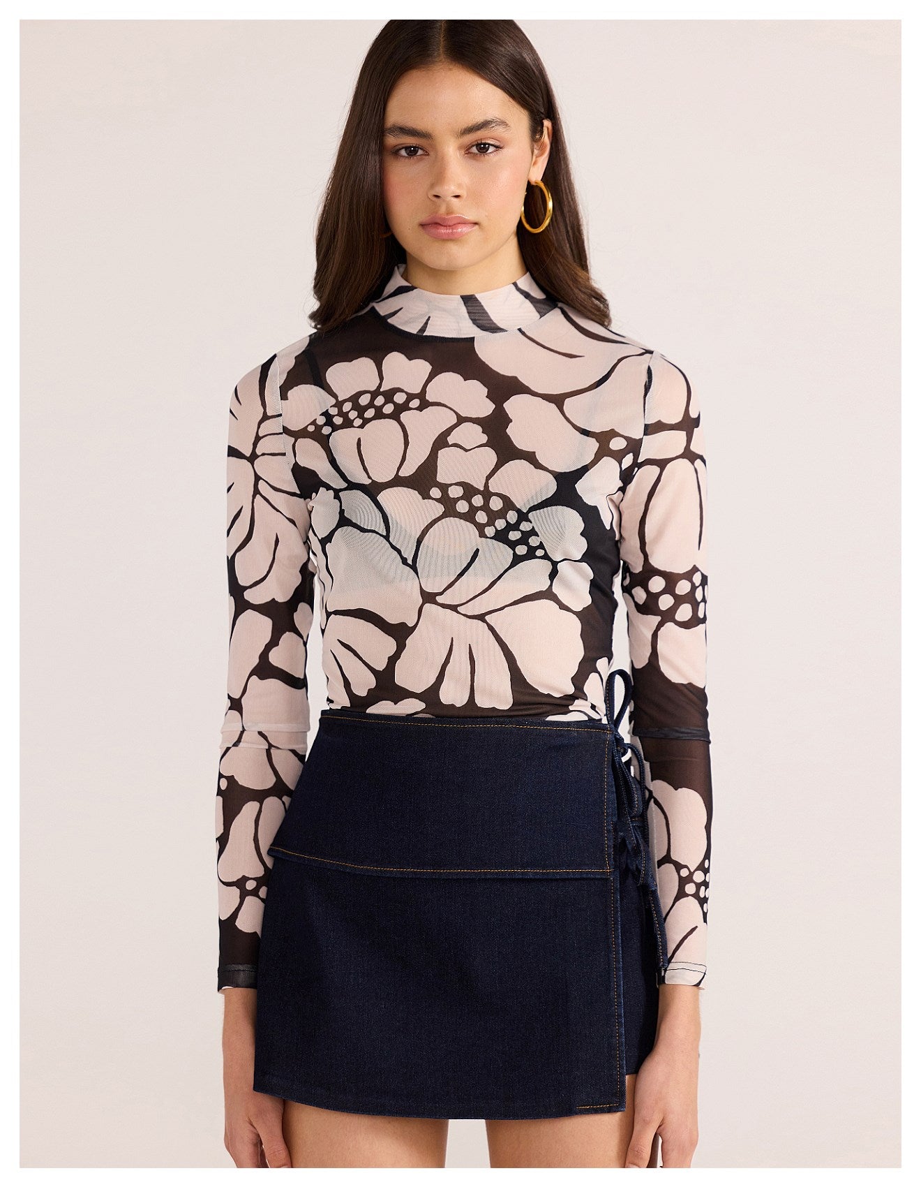 Turn heads and drop jaws in the MINKPINK PERSEPHONE MESH SKIVVY TOP with its jaw-dropping BLACK FLORAL pattern! This sassy little number features a MINKPINK exclusive print that's basically screaming "look at me!" The high neckline and full-length sleeves keep it classy, while the sheer fabric and fitted silhouette add a delicious dash of daring! Made with stretchy poly-elastane that hugs every curve just right. Layer over a black bralette for that peek-a-boo effect that'll have everyone asking, "Where'd you get that top?!" Floral has never been this fun!