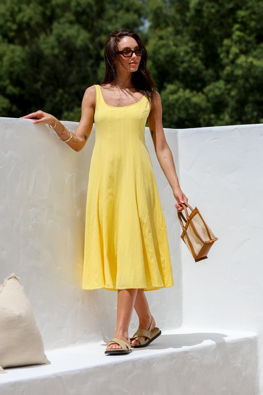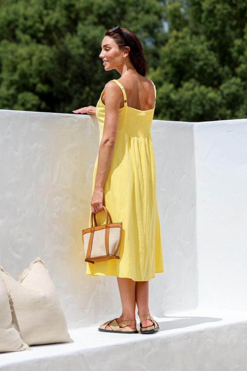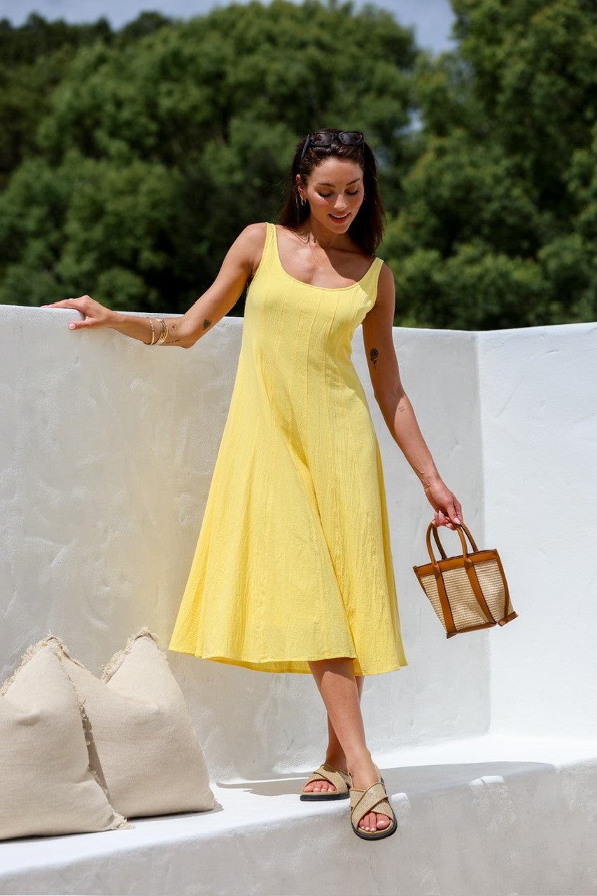 Be the sunshine in this textured cotton midi dress, also known as the MISS MARLOW MAYFAIR. In bright yellow, it's perfect for a day out exploring the city or a picnic in the park!