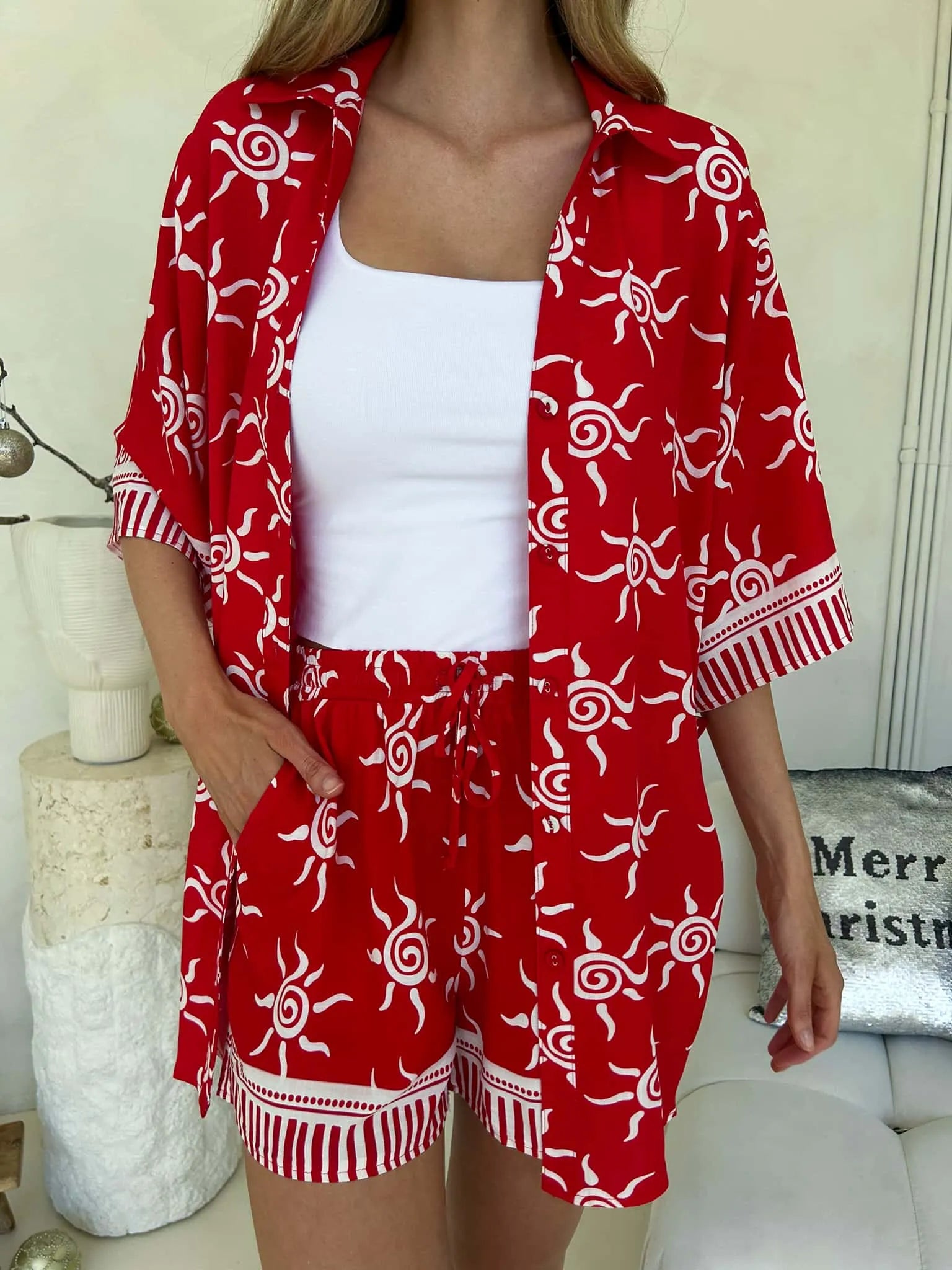Experience the ultimate summer style with the MYLK ARIA SET MYKONOS RED! Crafted from 100% breathable cotton, this set features a bold Mykonos print in red and white. The relaxed-fit top with a tie detail and the adjustable drawstring shorts provide both comfort and style. Perfect for warm-weather adventures, beach days, and casual outings.