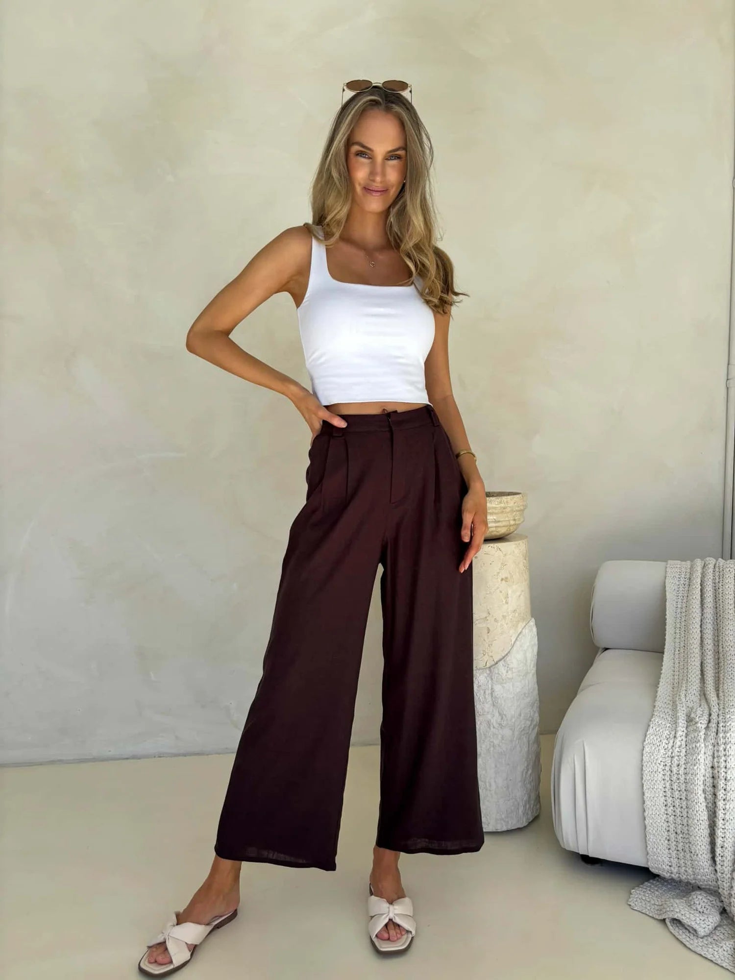 The MYLK THE LABEL Alani Pants in Chocolate combine timeless tailoring with everyday comfort. Made from a soft linen and cotton blend, these wide-leg pants feature a fitted front and an elasticated back waistband for a comfortable, flattering fit. They include belt loops, pleated front details, side and back pockets, and a button clasp with a zip fly. Fully lined, these pants offer a relaxed yet refined look perfect for any occasion.