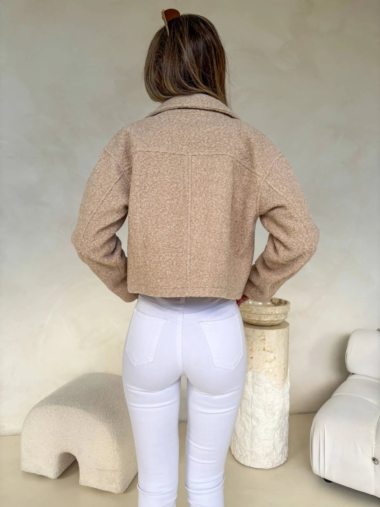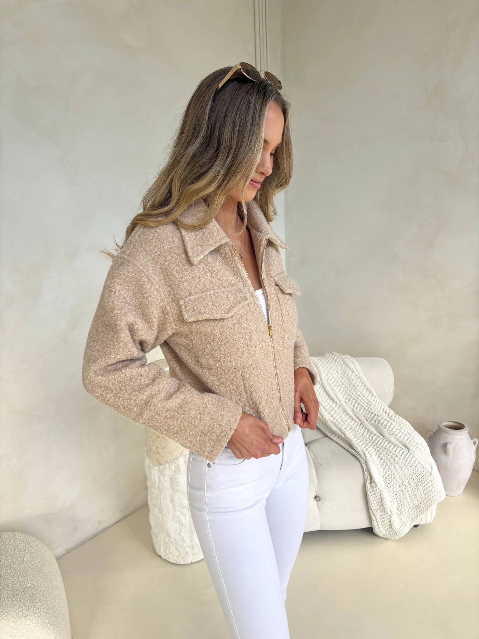 The MYLK THE LABEL Isla Jacket in beige is a stylish cropped outer layer perfect for this season. Made from soft textured polyester and fully lined for comfort, it features a luxe gold front zipper and functional chest pockets. Its versatile neutral tone and cropped fit make it easy to pair with high-waisted denim or tailored pieces, adding a polished touch to any outfit.