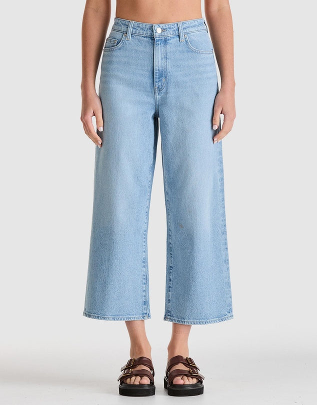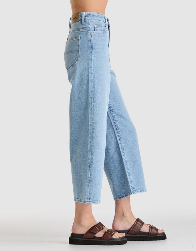 The Hi Wide Crop delivers effortless style with its high-waisted fit and dramatic A-line silhouette that flows beautifully from the hips. This cropped length hits just above the ankle for a modern, flattering finish. Featuring a vintage-inspired pale indigo wash, these jeans capture authentic denim character while hidden stretch keeps you comfortable all day. Details like contrast stitching, silver metal trims, and a vegan paper patch add character without fuss. Perfect for anyone after that coveted vintage look with contemporary comfort.